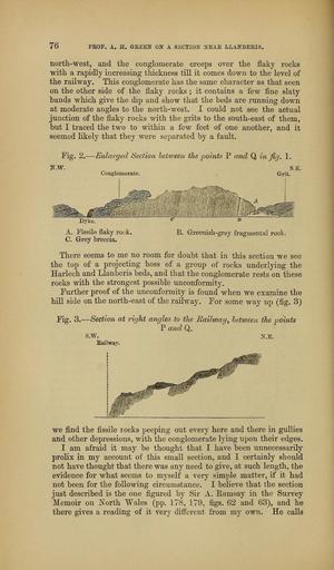 Keywords: The Quarterly journal of the Geological Society of London (14076839874).jpg 76 PEOF A H GEEElJf Olf A SECTIOJT iST AE LLAJ fBEElS <br> north-west and the conglomerate creeps over the flaky rocks <br> with a rapidly increasing thickness till it conies down to the level of <br> the railway This conglomerate has the same character as that seen <br> on the other side of the flaky rocks ; it contains a few fine slaty <br> bands which give the dip and show that the beds are rnnning down <br> at moderate angles to the north-west I could not see the actual <br> junction of the flaky rocks with the grits to the south-east of them <br> but I traced the two to within a few feet of one another and it <br> seemed likely that they were separated by a fault <br> Eig 2 ” Enlarged Section hetiueen the j oi7its P and Q in fig 1 <br> N W S E <br> Conglomerate Grit <br> Dyke <br> c <br> A Fissile flaky rock B Greenish-grey fragmental rock <br> C Grey breccia <br> There seems to me no room for doubt that in this section we see <br> the top of a projecting boss of a group of rocks underlying the <br> Harlech and Llanberis beds and that the conglomerate rests on these <br> rocks with the strongest possible unconformity <br> Further proof of the unconformity is found when we examine the <br> hill side on the north-east of the railway Por some way up fig 3 <br> Pig 3 ” Section at right angles to the Railivay hetiueen the points <br> P and Q <br> S W IST E <br> Eailwav <br> we find the fissile rocks peeping out every here and there in gullies <br> and other depressions with the conglomerate lying upon their edges <br> I am afraid it may be thought that I have been unnecessarily <br> prolix in my account of this small section and I certainly should <br> not have thought that there was any need to give at such length the <br> evidence for what seems to myself a very simple matter if it had <br> not been for the following circumstance I believe that the section <br> just described is the one figured by Sir A Eamsay in the Survey <br> Memoir on Xorth Wales pp 178 179 figs Q2 and 63 and he <br> there gives a reading of it very different from my own He calls 37046914 114009 51125 Page 76 Text 41 http //www biodiversitylibrary org/page/37046914 1885 Geological Society of London Biodiversity Heritage Library The Quarterly journal of the Geological Society of London v 41 1885 Geology Periodicals Smithsonian Libraries bhl page 37046914 dc identifier http //biodiversitylibrary org/page/37046914 smithsonian libraries Information field Flickr posted date ISOdate 2014-04-30 Check categories 2015 August 26 CC-BY-2 0 BioDivLibrary https //flickr com/photos/61021753 N02/14076839874 2015-08-26 04 58 54 cc-by-2 0 PD-old-70-1923 The Quarterly journal of the Geological Society of London 1885 Photos uploaded from Flickr by Fæ using a script |