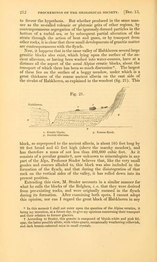 Keywords: The Quarterly journal of the Geological Society of London (12645637094).jpg 212 PROCEEDINGS OF THE GEOLOGICAL SOCIETY DcC 13 <br> to favour the hypothesis But whether produced in the same man- <br> ner as the so-called volcanic or plutonic grits of other regions by <br> contemporaneous segregation of the igneously-formed particles in the <br> bottom of a turbid sea or by subsequent partial alteration of the <br> strata through the action of heat and gases or by transport from <br> other rocks it is clear that these small developments of granitic matter <br> are contemporaneous with the flysch <br> Now it happens that in the same valley of Habkheren several large <br> granitic blocks also exist which lying upon the surface of the an- <br> cient alluvium or having been washed into water-courses have at a <br> distance all the aspect of the usual Alpine erratic blocks about the <br> transport of which there has been so much discussion The largest <br> of these lies on the surface of a boggy meadow under which is a <br> great thickness of the coarse ancient alluvia on the east side of <br> the rivulet of Habkheren as explained in the woodcut fig 21 This <br> Habkheren <br> X Erratic blocks <br> 7/ Ancient alluvium <br> g Eocene flysch <br> block so superposed to the ancient alluvia is about 105 feet long by <br> 90 feet broad and 45 feet high above the marshy meadow and <br> has therefore a mass of not less than 400 000 cubic feet As it <br> consists of a peculiar granite f now unknown to mineralogists in any <br> part of the Alps Professor Studer believes that like the very small <br> geodes and courses alluded to this block was also included in the <br> formation of the flysch and that during the disintegration of that <br> rock on the vertical sides of the valley it has rolled down into its <br> present position <br> Extending this view M Studer accounts in a similar manner for <br> what he calls the blocks of the Bolghen i e that they were derived <br> from pre-existing rocks and were originally encased in the flysch <br> during its formation After examining both spots I cannot adopt <br> this opinion nor can I regard the great block of Habkheren in any <br> In this memoir I shall not enter upon the question of the Alpine erratics it <br> being my intention at a future day to give my opinions concerning their transport <br> and their relation to former glaciers <br> t According to Studer this granite is composed of bluish-white and pink fel- <br> spar the latter possibly albite with white quartz occasionally weathering yellowish <br> and dark bronze-coloured mica in small crystals 35268856 109512 51125 Page 212 Text v 5 http //www biodiversitylibrary org/page/35268856 1849 Geological Society of London Biodiversity Heritage Library The Quarterly journal of the Geological Society of London v 5 1849 Geology Periodicals Smithsonian Libraries bhl page 35268856 dc identifier http //biodiversitylibrary org/page/35268856 smithsonian libraries Information field Flickr posted date ISOdate 2014-02-20 Check categories 2015 August 26 CC-BY-2 0 BioDivLibrary https //flickr com/photos/61021753 N02/12645637094 2015-08-27 10 53 04 cc-by-2 0 PD-old-70-1923 The Quarterly journal of the Geological Society of London 1849 Photos uploaded from Flickr by Fæ using a script |