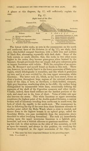 | Keywords: The Quarterly journal of the Geological Society of London (12645629494).jpg 1848 MURCHISON ON THE STRUCTURE OF THE ALPS <br> 205 <br> A glance at this diagram fig 17 will sufficiently explain the <br> case TT 1 i-i <br> Fig 17 <br> Right bank of the Iller <br> N N E Grunten S S W <br> Kammer-Eck C <br> Molasse <br> Fault <br> Eocene <br> Blolasse and nagelflue <br> Flysch <br> Nummulitic limestone alter- <br> nating with flysch <br> Transition band with Gryphsea <br> Cretaceous <br> b <br> Sonthofen <br> c cd e f f f g <br> Inoceramus limestone or chalk <br> Green sandstone and gault <br> White quartzose sandstone <br> Upper neocomian limestone <br> Caprotina ammonia <br> Lower neocomian limestone <br> The lowest visible rocks as seen in the escarpments on the north <br> and north-east faces of the Grunten a of fig 17 are shaly dark <br> grey thin-bedded compact limestone with a little iron and nodules <br> of black flint alternating repeatedly with dark shale Some of the <br> beds contain so much chlorite that like rocks in two other zones <br> higher in the series they become grass-green when bruised by the <br> hammer though previously they are simply dull grey calcareous grits <br> or impure limestones with schists With the exception of an ammo- <br> nite M Brunnerf and myself found no fossils in this rock There <br> can however be no doubt that it is the lower neocomian of Swiss geo- <br> logists which lithologically it resembles and like which it graduates <br> up into and is at once overlaid by the true upper neocomian white <br> limestone The latter rock b which as has been stated forms so <br> clear a horizon throughout large regions of the external calcareous <br> chain of the Alps is here as elsewhere a thick-bedded compact <br> light grey limestone weathering white in the cliifs ; the surface being <br> distinguished by innumerable white lines occasionally defining the <br> segments of the shell of the Caprotina ammonia and other fossils <br> Usually indeed these fossil outlines are the hardest portions of the <br> rock and stand out in the form of chert Veins of white calc spar <br> also traverse the strata This white limestone or upper neocomian <br> constitutes the highest point of the double-peaked Grunten a narrow <br> broken wall of limestone trending from north-east to south-west the <br> beds of which dip rapidly to the south-west The consequence is <br> that in following the top of the crest from these limestone summits to <br> another point called the Hohe Wand where a cross is erected and <br> thence down to the highest houses in an upland gorge called the <br> Gundalpe Hiitte you pass successively from the neocomian above <br> described to other overlying formations The rock c immediately <br> resting upon the upper neocomian limestone is a lightish grey <br> brownish and even a whitish siliceous or quartzose sandstone Find- <br> ing this rock in other sections on the sides of this mountain as well <br> as upon the summit and always in this position viz overlying the <br> limestone recognised as the upper neocomian of the Alps ; and <br> t This name has been misprinted Briinner in the preceding pages <br> VOL V ” PART I Q 35268849 109512 51125 Page 205 Text v 5 http //www biodiversitylibrary org/page/35268849 1849 Geological Society of London NameFound Caprotina ammonia NameFound Inoceramus NameConfirmed Inoceramus EOLID 4747366 NameBankID 4205663 Biodiversity Heritage Library The Quarterly journal of the Geological Society of London v 5 1849 Geology Periodicals Smithsonian Libraries bhl page 35268849 dc identifier http //biodiversitylibrary org/page/35268849 smithsonian libraries Information field Flickr posted date ISOdate 2014-02-20 Check categories 2015 August 26 CC-BY-2 0 BioDivLibrary https //flickr com/photos/61021753 N02/12645629494 2015-08-27 10 57 37 cc-by-2 0 PD-old-70-1923 The Quarterly journal of the Geological Society of London 1849 Photos uploaded from Flickr by Fæ using a script |