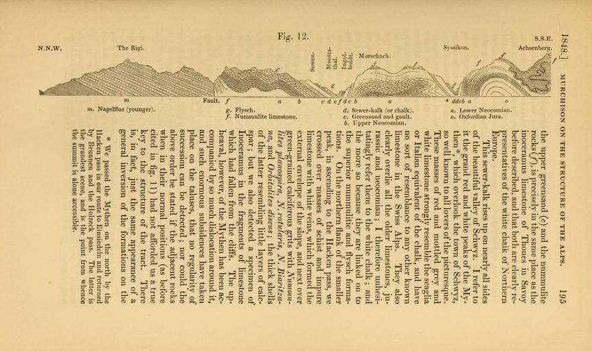 Keywords: The Quarterly journal of the Geological Society of London (12645138115).jpg 1S48 <br> MTIRCHISON ON THE STRUCTURE OF THE ALPS <br> 195 <br> S' <br> s; <br> ¢ Ploq <br> ¢U3M3S <br> S '»' <br> M <br> the upper greensand c and the nummuhte <br> rocks / is precisely in the same place as the <br> inoceramus limestone of Thones in Savoy <br> before described and that both are clearly re- <br> presentatives of the white chalk of iNorthern <br> 5 Europe <br> g This sewer-kalk rises up on nearly all sides <br> H of the beautiful valley of Schwyz I refer to <br> it the grand red and white peaks of the My- <br> then which overlook the town of Schwyz <br> so well known to all lovers of the picturesque <br> These masses of red and mottled grey and <br> white limestone strongly resemble the scaglia <br> or Italian equivalent of the chalk and have <br> no sort of resemblance to any other known <br> S; limestone in the Swiss Alps They also <br> I § clearly overlie all the older limestones ju- <br> g rassic and neocomian ; I therefore unhesi- <br> S S3 tatinglv refer them to the white chalk ; and <br> –ºÂ§ ¢ the more so because they are linked on to <br> the superior nummulitic and flysch forma- <br> tions On the northern flank of the smaller <br> peak in ascending to the Hacken pass we <br> crossed over masses of schist and impure <br> limestone with white veins which formed the <br> external envelope of the slope and next over <br> g green-grained calciferous grits with Nummu- <br> S lites planospira N rotularis N Biaritza- <br> i na and Orbitolites discus ; the thick shells <br> S of the latter resembling little layers of calc- <br> I spar ; but we also detected a specimen of <br> Inoceramus in the fragments of limestone <br> which had fallen from the cliifs The up- <br> heaval however of the Mythen has been ac- <br> companied by so much dislocation around it <br> and such enormous subsidences have taken <br> place on the taluses that no regularity of <br> succession can be detected ; nor could the <br> above order be stated if the adjacent rocks <br> when in their normal positions as before <br> cited in fig 11 had not afforded us a true <br> key to the structure of the tract There <br> is in fact just the same appearance of a <br> general inversion of the formations on the <br> We passed the Mythen on the north by the <br> Hacken pass in our route to Einsiedeln and retm-ned <br> by Brunnen and the Holzeck pass The latter is <br> the grandest scene and is the point from whence <br> the summit is alone accessible 35268839 109512 51125 Page 195 Text v 5 http //www biodiversitylibrary org/page/35268839 1849 Geological Society of London NameFound Inoceramus NameConfirmed Inoceramus EOLID 4747366 NameBankID 4205663 NameFound Nummulina rotularis NameConfirmed Nummulina EOLID 27483402 NameBankID 4261488 NameFound Orbitolites discus Biodiversity Heritage Library The Quarterly journal of the Geological Society of London v 5 1849 Geology Periodicals Smithsonian Libraries bhl page 35268839 dc identifier http //biodiversitylibrary org/page/35268839 smithsonian libraries Information field Flickr posted date ISOdate 2014-02-20 Check categories 2015 August 26 CC-BY-2 0 BioDivLibrary https //flickr com/photos/61021753 N02/12645138115 2015-08-27 10 52 10 cc-by-2 0 PD-old-70-1923 The Quarterly journal of the Geological Society of London 1849 Photos uploaded from Flickr by Fæ using a script |