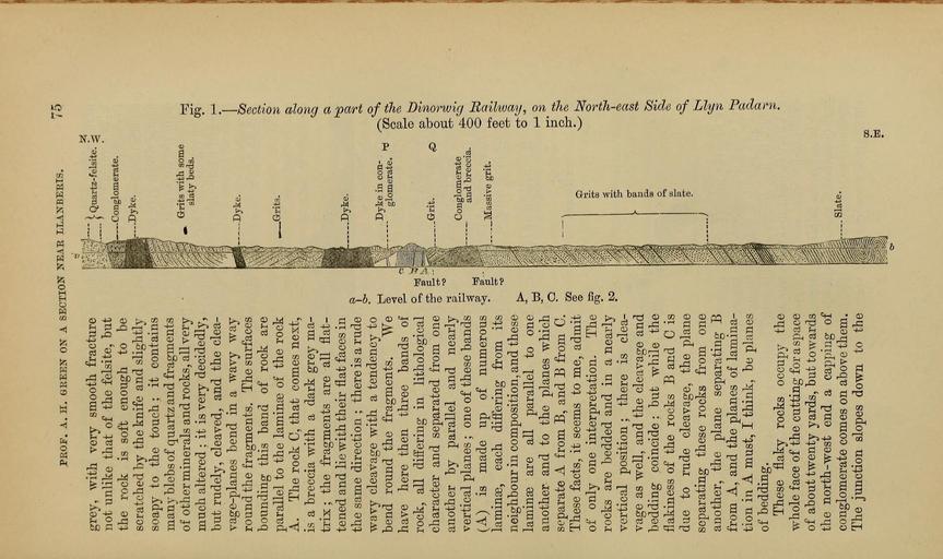| Keywords: The Quarterly journal of the Geological Society of London (13889736199).jpg PROF A H GREEN ON A SECTION NEAR LLANBERTS <br> 75 <br> grey with very smooth fracture <br> not unlike that of the felsite but <br> the rock is soft enough to be <br> scratched by the knife and slightly <br> soapy to the touch it contains <br> many blebs of quartz and fragments <br> of other minerals and rocks all very <br> much altered it is very decidedly <br> but rudely cleaved and the clea- <br> vage-planes bend in a wavy way <br> round the fragments The surfaces <br> bounding this band of rock are <br> parallel to the laminae of the rock <br> A The rock C that comes next <br> is a breccia with a dark grey ma- <br> trix; the fragments are all flat- <br> tened and lie with their flat faces in <br> the same direction ; there is a rude <br> wavy cleavage with a tendency to <br> bend round the fragments We <br> have here then three bands of <br> rock all differing in lithological <br> character and separated from one <br> another by parallel and nearly <br> vertical planes ; one of these bands <br> A is made up of numerous <br> laminae each differing from its <br> neighbour in composition and these <br> laminae are aU parallel to one <br> another and to the planes which <br> separate A from B and B from C <br> These facts it seems to me admit <br> of only one interpretation The <br> rocks are bedded and in a nearly <br> vertical position ; there is clea- <br> vage as well and the cleavage and <br> bedding coincide ; but while the <br> flakiness of the rocks B and C is <br> due to rude cleavage the plane <br> separating these rocks from one <br> another the plane separating B <br> from A and the planes of lamina- <br> tion in A must I think be planes <br> of bedding <br> These flaky rocks occupy the <br> whole face of the cutting for a space <br> of about twenty yards but towards <br> the north-west end a capping of <br> conglomerate comes on above them <br> The junction slopes down to the <br> - Quartz-felsite i <br> -Conglomerate <br> -Dyke <br> G-rits with some <br> slaty beds <br> -Dyke <br> Grits <br> Dyke <br> 21 <br> i <br> Dyke in con- <br> glomerate <br> Grit <br> Conglomerate <br> and breccia <br> _MassiTe grit <br> Slate <br> 0 <br> So <br> O ” I <br> <br> -§ <br> f <br> I- 37046913 114009 51125 Page 75 Text 41 http //www biodiversitylibrary org/page/37046913 1885 Geological Society of London Biodiversity Heritage Library The Quarterly journal of the Geological Society of London v 41 1885 Geology Periodicals Smithsonian Libraries bhl page 37046913 dc identifier http //biodiversitylibrary org/page/37046913 smithsonian libraries Information field Flickr posted date ISOdate 2014-04-30 Check categories 2015 August 26 CC-BY-2 0 BioDivLibrary https //flickr com/photos/61021753 N02/13889736199 2015-08-26 04 58 40 cc-by-2 0 PD-old-70-1923 The Quarterly journal of the Geological Society of London 1885 Photos uploaded from Flickr by Fæ using a script |
