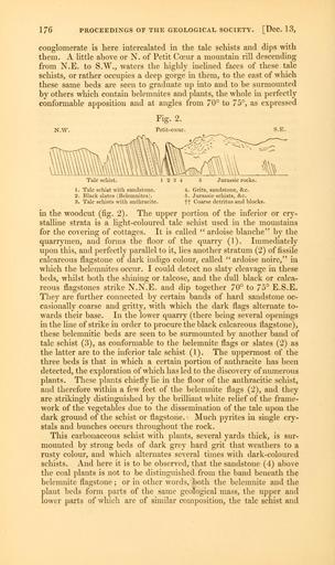 | Keywords: The Quarterly journal of the Geological Society of London (12645128603).jpg 176 <br> PROCEEDINGS OF THE GEOLOGICAL SOCIETY DeC 13 <br> conglomerate is here intercalated in the talc schists and dips with <br> them A little above or N of Petit Coeur a momitain rill descending <br> from N E to S W waters the highly inclined faces of these talc <br> schists or rather occupies a deep gorge in them to the east of which <br> these same beds are seen to graduate up into and to be surmounted <br> by others which contain belemnites and plants the whole in perfectly <br> conformable apposition and at angles from 70° to 75° as expressed <br> N W <br> Fig 2 <br> Petit-coeur <br> S E <br> Talc schist <br> 1 Talc schist with sandstone <br> 2 Black slates Belemnites <br> 3 Talc schists with anthracite <br> 12 3 4 5 Jurassic rocks <br> 4 Grits sandstone c <br> 5 Jurassic schists c <br> tt Coarse detritus and blocks <br> in the woodcut fig 2 The upper portion of the inferior or cry- <br> stalline strata is a light-coloured talc schist used in the mountains <br> for the covering of cottages It is called ' ardoise blanche by the <br> quarrymen and forms the floor of the quarry 1 Immediately <br> upon this and perfectly parallel to it lies another stratum 2 of fissile <br> calcareous flagstone of dark indigo colour called ardoise noire in <br> which the belemnites occur I could detect no slaty cleavage in these <br> beds whilst both the shining or talcose and the dull black or calca- <br> reous flagstones strike N N E and dip together 70° to 75° E S E <br> They are further connected by certain bands of hard sandstone oc- <br> casionally coarse and gritty with which the dark flags alternate to- <br> wards their base In the lower quarry there being several openings <br> in the line of strike in order to procure the black calcareous flagstone <br> these belemnitic beds are seen to be surmounted by another band of <br> talc schist 3 as conformable to the belemnite flags or slates 2 as <br> the latter are to the inferior talc schist I The uppermost of the <br> three beds is that in which a certain portion of anthracite has been <br> detected the exploration of which has led to the discovery of numerous <br> plants These plants chiefly lie in the floor of the anthracitic schist <br> and therefore within a few feet of the belemnite flags 2 and they <br> are strikingly distinguished by the brilliant white relief of the frame- <br> work of the vegetables due to the dissemination of the talc upon the <br> dark ground of the schist or flagstone Much pyrites in single cry- <br> stals and bunches occurs throughout the rock <br> This carbonaceous schist with plants several yards thick is sur- <br> mounted by strong beds of dark grey hard grit that weathers to a <br> rusty colour and which alternates several times with dark-coloured <br> schists And here it is to be observed that the sandstone 4 above <br> the coal plants is not to be distinguished from the band beneath the <br> belemnite flagstone; or in other words hoth the belemnite and the <br> plant beds form parts of the same geological mass the upper and <br> lower parts of which are of similar composition the talc schist and 35268820 109512 51125 Page 176 Text v 5 http //www biodiversitylibrary org/page/35268820 1849 Geological Society of London NameFound Belemnites NameConfirmed Belemnites EOLID 4780330 NameBankID 4089090 Biodiversity Heritage Library The Quarterly journal of the Geological Society of London v 5 1849 Geology Periodicals Smithsonian Libraries bhl page 35268820 dc identifier http //biodiversitylibrary org/page/35268820 smithsonian libraries Information field Flickr posted date ISOdate 2014-02-20 Check categories 2015 August 26 CC-BY-2 0 BioDivLibrary https //flickr com/photos/61021753 N02/12645128603 2015-08-27 10 57 02 cc-by-2 0 PD-old-70-1923 The Quarterly journal of the Geological Society of London 1849 Photos uploaded from Flickr by Fæ using a script |