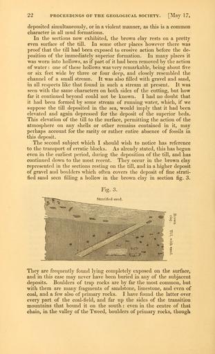 Keywords: The Quarterly journal of the Geological Society of London (12645079763).jpg 22 <br> PROCEEDINGS OF THE GEOLOGICAL SOCIETY MaV 17 <br> deposited simultaneously or in a violent manner as this is a common <br> character in all mud formations <br> In the sections now exhibited the brown clay rests on a pretty <br> even surface of the till In some other places however there was <br> proof that the till had been exposed to erosive action before the de- <br> position of the immediately superior formation In many places it <br> was worn into hollows as if part of it had been removed by the action <br> of water one of these hollows was very remarkable being about five <br> or six feet wide by three or four deep and closely resembled the <br> channel of a small stream It was also filled with gravel and sand <br> in all respects like that found in such a stream at present It was <br> seen with the same characters on both sides of the cutting but how <br> far it continued beyond could not be known I had no doubt that <br> it had been formed by some stream of rummig water which if we <br> suppose the till deposited in the sea would imply that it had been <br> elevated and again depressed for the deposit of the superior beds <br> This elevation of the till to the surface permitting the action of the <br> atmosphere on any shells or other remains contained in it may <br> perhaps accomit for the rarity or rather entire absence of fossils in <br> this deposit <br> The second subject which I should wish to notice has reference <br> to the transport of erratic blocks As already stated this has begun <br> even in the earliest period during the deposition of the till and has <br> continued down to the most recent They occur in the brovra clay <br> represented in the sections resting on the till and in a higher deposit <br> of gravel and boulders which often covers the deposit of fine strati- <br> fied sand seen filling a hollow in the brownii clay in section fig 3 <br> Fig 3 <br> Stratified sand <br> They are frequently found lying completely exposed on the surface <br> and in this case may never have been buried in any of the subjacent <br> deposits Boulders of trap rocks are by far the most common but <br> with them are many fragments of sandstone limestone and even of <br> coal and a few also of primary rocks I have found the latter over <br> every part of the coal-field and far up the sides of the transition <br> mountains that bound it on the south even in the centre of that <br> chain in the valley of the Tweed boulders of primary rocks though 35268656 109512 51125 Page 22 Text v 5 http //www biodiversitylibrary org/page/35268656 1849 Geological Society of London Biodiversity Heritage Library The Quarterly journal of the Geological Society of London v 5 1849 Geology Periodicals Smithsonian Libraries bhl page 35268656 dc identifier http //biodiversitylibrary org/page/35268656 smithsonian libraries Information field Flickr posted date ISOdate 2014-02-20 Check categories 2015 August 26 CC-BY-2 0 BioDivLibrary https //flickr com/photos/61021753 N02/12645079763 2015-08-27 10 52 34 cc-by-2 0 PD-old-70-1923 The Quarterly journal of the Geological Society of London 1849 Photos uploaded from Flickr by Fæ using a script |