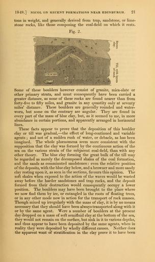 Keywords: The Quarterly journal of the Geological Society of London (12645076783).jpg 1848 NICOL ON RECENT FORMATIONS NEAR EDINBURGH 21 <br> tons in weight and generally derived from trap sandstone or lime- <br> stone rocks like those composing the coal-field on which it rests <br> Fig 2 <br> Some of these boulders however consist of granite mica-slate or <br> other primary strata and must consequently have been carried a <br> greater distance as none of these rocks are found nearer than from <br> forty-five to fifty miles and granite in any quantity only at seventy <br> miles' distance These boulders are generally rounded and water- <br> worn but some on the contrary are angular They are found in <br> every part of the mass of blue clay but as it seemed to me in more <br> abundance in certain portions and apparently arranged in horizontal <br> lines <br> These facts appear to prove that the deposition of this boulder <br> clay or till was gradual ” the effect of long-continued and variable <br> agents ; and not of a sudden rush of water or debacle as has been <br> imagined The whole phsenomena seem more consistent with the <br> supposition that the clay was formed by the continuous action of the <br> sea on the various strata of the subjacent coal-field than with any <br> other theory The blue clay forming the great bulk of the till may <br> be regarded as merely the decomposed shales of the coal formation <br> and the sands as comminuted sandstones even the relative position <br> of the deposits with the blue clay below and a browner and more sandy <br> clay resting upon it as seen in the sections favours this opinion The <br> soft shales when exposed to the action of the waves would be wasted <br> away before the harder sandstones and trap rocks and the deposit <br> formed from their destruction would consequently occupy a lower <br> position The boulders may have been brought to the place where <br> we now find them by ice or entangled in the roots of floating trees <br> or in any other mode now in action for the transport of rock masses <br> Though mixed up irregularly with the mass of clay it is by no means <br> necessary that they should have been always transported along with it <br> or by the same agent Were a number of boulders at the present <br> day dropped on a mass of soft semifluid clay at the bottom of the sea <br> they would not remain on the surface but sink in it to various depths <br> and thus appear to have been deposited by the same agents when in <br> reality they were deposited by wholly different causes Neither does <br> the apparent want of stratification in the clay prove it to have been 35268655 109512 51125 Page 21 Text v 5 http //www biodiversitylibrary org/page/35268655 1849 Geological Society of London Biodiversity Heritage Library The Quarterly journal of the Geological Society of London v 5 1849 Geology Periodicals Smithsonian Libraries bhl page 35268655 dc identifier http //biodiversitylibrary org/page/35268655 smithsonian libraries Information field Flickr posted date ISOdate 2014-02-20 Check categories 2015 August 26 CC-BY-2 0 BioDivLibrary https //flickr com/photos/61021753 N02/12645076783 2015-08-27 10 55 09 cc-by-2 0 PD-old-70-1923 The Quarterly journal of the Geological Society of London 1849 Photos uploaded from Flickr by Fæ using a script |