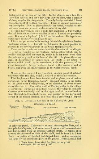 | Keywords: The Quarterly journal of the Geological Society of London (12513180364).jpg But the pit requires further search especially as the <br> workmen were not present on the occasion of my visit <br> I found however in bed a a rude flint implement ; but whether <br> derived from the surface or peculiar to bed a I could not positively <br> say It was at a depth of 1 foot from the surface Its type is not <br> sufficiently distinctive to indicate its age <br> I have not yet succeeded in tracing this old shingle-beach further <br> westward where it is desirable to determine its exact position in <br> relation to the several gravels of the South-Hampshire area <br> There can be no mistake made about the character of the shingle <br> It is not so rounded as the Tertiary flint-pebbles which can be <br> readily distinguished amongst it while it is far more worn than <br> the subangular gravel ac the base of the hill In places there are <br> signs of disturbance as though from the effects of ice-action ” a <br> feature which would be in accordance with the presence of the <br> great transported foreign boulders found in the marine gravel of <br> Selsea and with the chalk boulders in the Chichester sea-beach <br> While on this subject I may mention another point of interest <br> connected with this area which I noticed on the same occasion <br> Flint implements have been found at various places and at various <br> elevations in the Hampshire basin ” amongst others in the valley <br> of the Avon near Fordingbridge at an elevation of about 40 feet <br> above the river f Five mUes north of Fordingbridge is the village <br> of Downton On the hiU immediately east of the village is Packham <br> Common now enclosed ; and on the right hand of the road leading <br> from Redlinch to Standlinch Down and passing by the north-east <br> corner of the former common is a small chalk-pit see fig 1 capped <br> Fig 1 ” Section on East side of the Valley of the Avon <br> Distance 1 mile <br> Eiver Avon Downton <br> 117 feet 144 feet to 183 feet 266 feet to 298 feet Pit 320 feet <br> level <br> by ochreous gravel This consists as usual of subangular flints and a <br> few pebbles of quartz with some worn fragments of iron-sandstone <br> and flint pebbles from the adjacent Tertiary strata It reposes upon <br> a worn and furrowed surface of the chalk and is from 2 to 7 feet <br> thick A portion of this bed had slipped down ; and on examining <br> the talus for the constituent parts of the gravel I found a small flint <br> Evans Quart Journ Geol Soc 1864 vol xx p 188 <br> t Codrington ibid vol xxti p 537 34984982 108770 51125 Page 39 Text v 28 http //www biodiversitylibrary org/page/34984982 1872 Geological Society of London Biodiversity Heritage Library The Quarterly journal of the Geological Society of London v 28 1872 Geology Periodicals Smithsonian Libraries bhl page 34984982 dc identifier http //biodiversitylibrary org/page/34984982 smithsonian libraries Information field Flickr posted date ISOdate 2014-02-14 Check categories 2015 August 26 CC-BY-2 0 BioDivLibrary https //flickr com/photos/61021753 N02/12513180364 2015-08-27 09 59 27 cc-by-2 0 PD-old-70-1923 The Quarterly journal of the Geological Society of London 1872 Photos uploaded from Flickr by Fæ using a script |