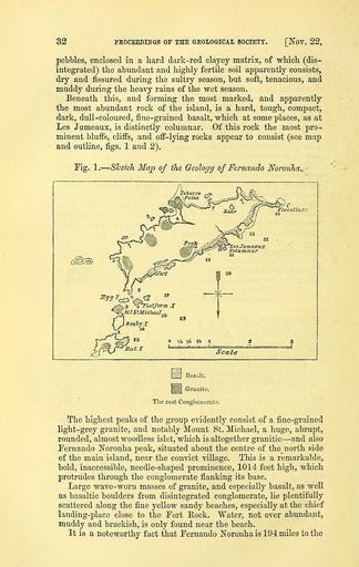 | Keywords: The Quarterly journal of the Geological Society of London (12513166724).jpg 82 <br> PEOCEEDINGS OF THE GEOLOGICAL SOCIETT NoV 22 <br> pebbles enclosed in a hard dark-red clayey matrix of which dis- <br> integrated the abundant and highly fertUe soil apparently consists <br> dry and fissured during the sultry season but soft tenacious and <br> muddy during the heavy rains of the wet season <br> Beneath this and forming the most marked and apparently <br> the most abundant rock of the island is a hard tough compact <br> dark dull-coloured fine-grained basalt which at some places as at <br> Les Jumeaux is distinctly columnar Of this rock the most pro- <br> minent bluff's cliffs and off-lying rocks appear to consist see map <br> and outHne figs 1 and 2 <br> Fig 1 ” SJcetch Map of the Geology of Fernando Noronlia <br> ;;£5;;;S <br> PgMtStMiQliacl <br> xooiby T <br> l jmj <br> -/i 1 X <br> ' ' ' – – -- <br> Scale <br> Ym Basalt <br> G-ranite <br> Tlie rest Conglomerate <br> The highest peaks of the group evidently consist of a fine-grained <br> light-grey granite and notably Mount St Michael a huge abrupt <br> rounded almost woodless islet which is altogether granitic ” and also <br> Fernando Noronha peak situated about the centre of the north side <br> of the main island near the convict village This is a remarkable <br> bold inaccessible needle-shaped prominence 1014 feet high which <br> protrudes through the conglomerate flanking its base <br> Large wave-worn masses of granite and especially basalt as well <br> as basaltic boulders from disintegrated conglomerate lie plentifully <br> scattered along the fine yellow sandy beaches especially at the chief <br> landing-place close to the Port Rock Water not over abundant <br> muddy and brackish is only found near the beach <br> It is a noteworthy fact that Fernando Noronhais 194 miles to the 34984973 108770 51125 Page 32 Text v 28 http //www biodiversitylibrary org/page/34984973 1872 Geological Society of London Biodiversity Heritage Library The Quarterly journal of the Geological Society of London v 28 1872 Geology Periodicals Smithsonian Libraries bhl page 34984973 dc identifier http //biodiversitylibrary org/page/34984973 smithsonian libraries Information field Flickr posted date ISOdate 2014-02-14 Check categories 2015 August 26 CC-BY-2 0 BioDivLibrary https //flickr com/photos/61021753 N02/12513166724 2015-08-27 10 01 51 cc-by-2 0 PD-old-70-1923 The Quarterly journal of the Geological Society of London 1872 Photos uploaded from Flickr by Fæ using a script |