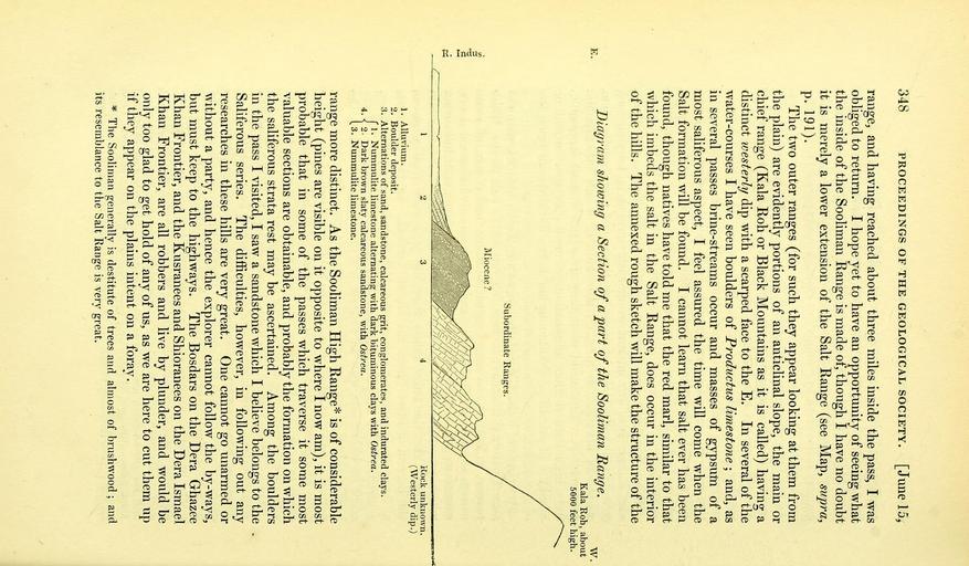 Keywords: The Quarterly journal of the Geological Society of London (12511986485).jpg 348 PROCEEDINGS OF THE GEOLOGICAL SOCIETY June 15 <br> range and having reached about three miles inside the pass I was <br> obliged to return I hope yet to have an opportunity of seeing what <br> the inside of the Sooliman Range is made of though I have no doubt <br> it is merely a lower extension of the Salt Range see Map supra <br> p 191 <br> The two outer ranges for such they appear looking at them from <br> the plain are evidently portions of an anticlinal slope the main or <br> chief range Kala Roh or Black Mountains as it is called having a <br> distinct ivesterly dip with a scarped face to the E In several of the <br> water-courses I have seen boulders of Productus limestone ; and as <br> in several passes brine-streams occur and masses of gypsutti of a <br> most saliferous aspect I feel assured the time will come when the <br> Salt formation will be found I cannot learn that salt ever has been <br> found though natives have told me that the red marl similar to that <br> which imbeds the salt in the Salt Range does occur in the interior <br> of the hills The annexed rough sketch will make the structure of the <br> Diagram showing a Section of a part of the Sooliman Range <br> Kala Rob about <br> 5000 feet high <br> 12 3 4 iiock unknown <br> Westerly dip <br> 1 Alluvium <br> 2 Boulder deposit <br> 3 Alternations of sand sandstone calcareous grit conglomerates and indurated clays <br> I 1 Nummulite limestone alternating with dark bituminous clays with Ostrea <br> 4 2 Dark brown slaty calcareous sandstone with Ostrea <br> 1 3 Nummulite limestone <br> range more distinct As the Sooliman High Range is of considerable <br> height pines are visible on it opposite to where I now am it is most <br> probable that in some of the passes which traverse it some most <br> valuable sections are obtainable and probably the formation on which <br> the saliferous strata rest may be ascertained Among the boulders <br> in the pass I visited I saw a sandstone which I believe belongs to the <br> Saliferous series The difficulties however in following out any <br> researches in these hills are very great One cannot go unarmed or <br> without a party and hence the explorer cannot follow the by-ways <br> but must keep to the highways The Bosdars on the Dera Ghazee <br> Khan Frontier and the Kusranees and Shioranees on the Dera Ismael <br> Khan Frontier are all robbers and live by plunder and would be <br> only too glad to get hold of any of us as we are here to cut them up <br> if they appear on the plains intent on a foray <br> The Sooliman generally is destitute of trees and almost of brushwood ; and <br> its resemblance to the Salt Range is very great 34983481 108767 51125 Page 348 Text v 9 http //www biodiversitylibrary org/page/34983481 1853 Geological Society of London NameFound Dera NameConfirmed Dera NameBankID 4139169 NameFound Ostrea NameConfirmed Ostrea EOLID 10719983 NameBankID 2692450 NameFound Productus NameConfirmed Productus NameBankID 4310929 Biodiversity Heritage Library The Quarterly journal of the Geological Society of London v 9 1853 Geology Periodicals Smithsonian Libraries bhl page 34983481 dc identifier http //biodiversitylibrary org/page/34983481 smithsonian libraries Information field Flickr posted date ISOdate 2014-02-14 Check categories 2015 August 26 CC-BY-2 0 BioDivLibrary https //flickr com/photos/61021753 N02/12511986485 2015-08-27 09 54 09 cc-by-2 0 PD-old-70-1923 The Quarterly journal of the Geological Society of London 1853 Photos uploaded from Flickr by Fæ using a script |