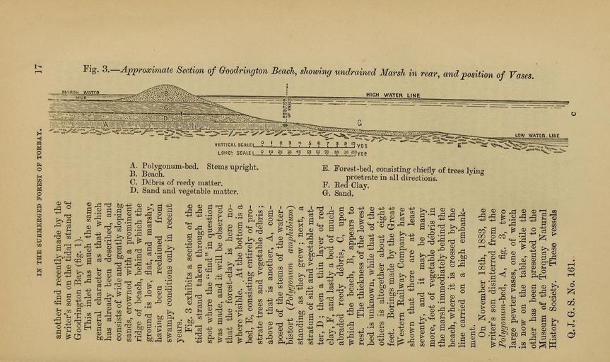 Keywords: The Quarterly journal of the Geological Society of London (14076823654).jpg IN THE SUBMERGED FOREST OF TORBAT <br> 17 <br> another find recentl ' made by the <br> writer's son on the tidal strand of <br> Goodrington Bay fig 1 <br> This inlet has much the same <br> general character as that which <br> has already been described and <br> consists of wide and gently sloping <br> sands crowned with a prominent <br> ridge of beach behind which the <br> ground is low flat and marshy <br> having been reclaimed from <br> swampy conditions only in recent <br> years <br> Fig 3 exhibits a section of the <br> tidal strand taken through the <br> spot where the find in question <br> was made and it will be observed <br> that the forest-clay is here no- <br> where visible At the bottom is a <br> bed E consisting entirely of pro- <br> strate trees and vegetable debris ; <br> above that is another A com- <br> posed of the stems of the water- <br> bistort Polygonum amphihium <br> standing as they grew ; next a <br> stratum of silt and vegetable mat- <br> ter D ; then a thin layer of red <br> clay P and lastly a bed of much- <br> abraded reedy debris C upon <br> which the beach B appears to <br> rest The thickness of the lowest <br> bed is unknown while that of the <br> others is altogether about eight <br> feet Borings made by the Great <br> Western Eailway Company have <br> shown that there are at least <br> seventy and it may be many <br> more feet of vegetable debris in <br> the marsh immediately behind the <br> beach where it is crossed by the <br> line carried on a high embank- <br> ment <br> On November 18th 1883 the <br> writer's son disinterred from the <br> Polygonum-'hed A fig 3 two <br> large pewter vases one of which <br> is now on the table while the <br> other has been presented to the <br> Museum of the Torquay N atural <br> History Societ These vessels <br> Q J G S No 161 37046815 114009 51125 Page 17 Text 41 http //www biodiversitylibrary org/page/37046815 1885 Geological Society of London NameFound Polygonum NameConfirmed Polygonum EOLID 38335 NameBankID 2646993 Biodiversity Heritage Library The Quarterly journal of the Geological Society of London v 41 1885 Geology Periodicals Smithsonian Libraries bhl page 37046815 dc identifier http //biodiversitylibrary org/page/37046815 smithsonian libraries Information field Flickr posted date ISOdate 2014-04-30 Check categories 2015 August 26 CC-BY-2 0 BioDivLibrary https //flickr com/photos/61021753 N02/14076823654 2015-08-26 04 57 26 cc-by-2 0 PD-old-70-1923 The Quarterly journal of the Geological Society of London 1885 Photos uploaded from Flickr by Fæ using a script |