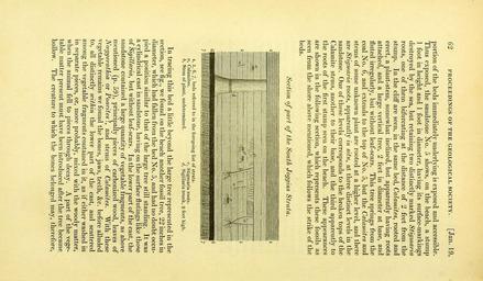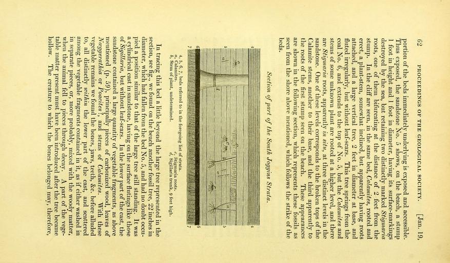 | Keywords: The Quarterly journal of the Geological Society of London (12512241834).jpg 62 PROCEEDINGS OF THE GEOLOGICAL SOCIETY Jan 19 <br> portion of the beds immediately underlying is exposed and accessible <br> Thus exposed the sandstone No 5 shows on the beach a stump <br> 1 foot in height and 1 foot in diameter having its surface-markings <br> destroyed by the sea but retaining two distinctly marked Stigmaria <br> roots one of them bifurcating at the distance of 2 feet from the <br> stump In the cliff are seen in the same bed Calamites rooted and <br> erect a plant-stem somewhat inclined but apparently having roots <br> attached and a large vertical tree 2 feet in diameter at base and <br> fluted irregularly but without leaf-scars This tree springs from the <br> coal No 6 and extends to the top of No 5 but the Calamites and <br> stems of some unknown plant are rooted at a higher level and there <br> are Stigmaria roots apparently in situ at three distinct levels in the <br> sandstone One of these levels corresponds to the broken tops of the <br> Calamite stems another to their base and the third apparently to <br> the roots of the first stump seen on the beach These appearances <br> are shown in the following section which represents these fossils as <br> seen from the shore above mentioned which follows the strike of the <br> beds <br> Section of part of the South Joggins Strata <br> x- <br> mmm m SSy <br> 4 5 6 7 beds referred to in the foregoing list of strata <br> a Calamites c Stigmaria roots <br> A stem of plant undetermined d Sigillaria trunk 9 feet high <br> In tracing this bed a little beyond the large tree represented in the <br> section see fig we found on the beach another fossil tree 22 inches in <br> diameter which had fallen from the bed No 5 and had no doubt occu- <br> pied a position similar to that of the large tree still standing It was <br> a cyhndrical cast in sandstone having on the surface flutings like those <br> of Sigillaria but without leaf-scars In the lower part of the cast the <br> sandstone contained a large quantity of vegetable fragments as above <br> mentioned p 59 principally pieces of carbonized wood leaves of <br> Nceggerathia or Poacitesi and stems of Calamites With these <br> vegetable remains we found the bones jaws teeth c before alluded <br> to all distinctly within the lower part of the cast and scattered <br> among the vegetable fragments contained in it as if either washed in <br> in separate pieces or more probably mixed with the woody matter <br> when the animal fell to pieces through decay A part of the vege- <br> table matter present must have been introduced after the tree became <br> hollow The creature to which the bones belonged may therefore 34983157 108767 51125 Page 62 Text v 9 http //www biodiversitylibrary org/page/34983157 1853 Geological Society of London NameFound Calamite NameConfirmed Calamite NameBankID 4098474 NameFound Calamites NameConfirmed Calamites EOLID 13132177 NameBankID 4098476 NameFound Sigillaria NameConfirmed Sigillaria EOLID 13132168 NameBankID 4343184 NameFound Stigmaria NameConfirmed Stigmaria EOLID 6133541 NameBankID 4853119 Biodiversity Heritage Library The Quarterly journal of the Geological Society of London v 9 1853 Geology Periodicals Smithsonian Libraries bhl page 34983157 dc identifier http //biodiversitylibrary org/page/34983157 smithsonian libraries Information field Flickr posted date ISOdate 2014-02-14 Check categories 2015 August 26 CC-BY-2 0 BioDivLibrary https //flickr com/photos/61021753 N02/12512241834 2015-08-27 09 55 38 cc-by-2 0 PD-old-70-1923 The Quarterly journal of the Geological Society of London 1853 Photos uploaded from Flickr by Fæ using a script |