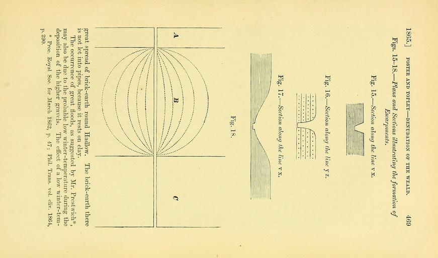 | Keywords: The Quarterly journal of the Geological Society of London (12471314883).jpg 1865 POSTEE AND TOPLET DENTJDATIOjST OP THE WEALD <br> 469 <br> Figs 15-18 Plmis and Sections illustrating the formation of <br> Bscarjwients <br> Fig 15 Section along the line v x <br> Fig 16 Section along the line yz <br> Fig 17 - Section along the line vx <br> Fig 18 <br> ' <br> A <br> ' //' ' -' ' ' <br> M ' ~-v\\ <br> C <br> ;0-; ;- li; <br> -;-- 'y /\ <br> -' / / <br> ' --' <br> great spread of brick-earth round Hadlow The brick-earth there <br> is not let into pipes because it rests on clay <br> The occurrence of great floods as suggested by Mr Prcstwieh <br> may also be due to the probable low winter-temperature during the <br> deposition of the higher gravels The effect of a low winter-tem- <br> Proc Royal Soc for March 1862 p 47; Phil Trans vol cliv 1864 <br> p 290 34892147 108495 51125 Page 469 Text v 21 http //www biodiversitylibrary org/page/34892147 1865 Geological Society of London Biodiversity Heritage Library The Quarterly journal of the Geological Society of London v 21 1865 Geology Periodicals Smithsonian Libraries bhl page 34892147 dc identifier http //biodiversitylibrary org/page/34892147 smithsonian libraries Information field Flickr posted date ISOdate 2014-02-12 Check categories 2015 August 26 CC-BY-2 0 BioDivLibrary https //flickr com/photos/61021753 N02/12471314883 2015-08-27 10 02 39 cc-by-2 0 PD-old-70-1923 The Quarterly journal of the Geological Society of London 1865 Photos uploaded from Flickr by FĂŚ using a script |