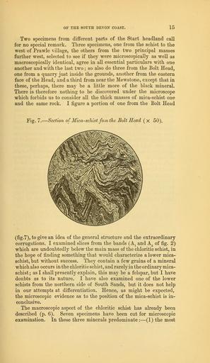 Keywords: The Quarterly journal of the Geological Society of London (13889136129).jpg OF THE SOUTH DEVON COAST 15 <br> Two specimens from different parts of the Start headland call <br> for no special remark Three specimens one from the schist to the <br> west of Prawle village the others from the two principal masses <br> further west selected to see if they were microscopically as well as <br> macroscopically identical agree in all essential particulars with one <br> another and with the la st two ; so also do three from the Bolt Head <br> one from a quarry just inside the grounds another from the eastern <br> face of the Head and a third from near the Mewstone except that in <br> these perhaps there may be a little more of the black mineral <br> There is therefore nothing to be discovered under the microscope <br> which forbids us to consider all the thick masses of mica-schist one <br> and the same rock I figure a portion of one from the Bolt Head <br> Fig 7 ” Section oC Mica-sclmt fomthe Bolt Head x 50 <br> fig 7 to give an idea of the general structure and the extraordinary <br> corrugations I examined slices from the bands A and A of fig 2 <br> which are undoubtedly below the main mass of the chloritic schist in <br> the hope of finding something that would characterize a lower mica- <br> schist but without success They contain a few grains of a mineral <br> which also occurs in the chloritic schist and rarely in the ordinary mica- <br> schist; as I shall presently explain this may be a felspar but I have <br> doubts as to its nature I have also examined one of the lower <br> schists from the northern side of South Sands but it does not help <br> in our attempts at differentiation Hence as might be expected <br> the microscopic evidence as to the position of the mica-schist is in- <br> conclusive <br> The macroscopic aspect of the chloritic schist has already been <br> described p 6 Seven specimens have been cut for microscopic <br> examination In these three minerals predominate ” 1 the most 36940734 113697 51125 Page 15 Text 40 http //www biodiversitylibrary org/page/36940734 1884 Geological Society of London Biodiversity Heritage Library The Quarterly journal of the Geological Society of London v 40 1884 Geology Periodicals Smithsonian Libraries bhl page 36940734 dc identifier http //biodiversitylibrary org/page/36940734 smithsonian libraries Information field Flickr posted date ISOdate 2014-04-30 Check categories 2015 August 26 CC-BY-2 0 BioDivLibrary https //flickr com/photos/61021753 N02/13889136129 2015-08-26 05 56 30 cc-by-2 0 PD-old-70-1923 The Quarterly journal of the Geological Society of London 1884 Photos uploaded from Flickr by Fæ using a script |