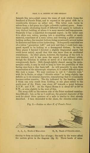 | Keywords: The Quarterly journal of the Geological Society of London (14075753995).jpg 6 PROP T G BOIS'NEY OS THE GEOLOGY <br> beneath this mica-schist comes the mass of rock which forms the <br> headland of Prawle Point and is exposed in the grand cliffs for a <br> considerable distance on either side This latter rock varies in <br> colour from a dull green to a light j ellowish epidote green Some- <br> times rapidly alternating bands of different tint appear to indicate a <br> very distinct bedding at others it is more massive and homogeneous <br> Generally it has a somewhat decomposed aspect ; in the latter case <br> it is often Yery rotten passing into a crumbling earthy or sandy <br> material sometimes of a rusty colour and forming a pitted carious- <br> looking surface the rounded hollows being occasionally several inches <br> in diameter and three or four inches deep It frequently reminded me <br> of a rotten greenstone tuff; and now and then I could have sup- <br> posed myself to be looking at a decomposed diabase In two or <br> three places I fancied I detected a slightly fragmental aspect but <br> could never satisfy myself that this was more than an accidental <br> resemblance In other places however the banding of the rock is <br> very distinct and it has more the aspect of an ordinary schist <br> though the foliation is seldom or never of a kind that renders it <br> conspicuously fissile Still though rightly classed among the meta- <br> morphic rocks it may be well to keep in view the possibility of this <br> having once been a fine basic tuff As will presently be seen from <br> examination of the microscopic structure it is rather difficult to give <br> this rock a name We may continue to call it chlorite rock <br> with Le la Beche or adopt chloritic schist as being slightly less <br> definite as to its mineral character remembering that it occasionally <br> becomes rather massive The dip indicated by the banding which <br> I think can only result from bedding at one place rather to the <br> north-west of the Point was about 45° towards a point between <br> N N W and N W At the Signal House it is about 45° or 50° to <br> Is' W or even slightly to the west of this <br> The steep cliffs on the eastern side of the Point rendered examina- <br> tion difficult ; but so far as I conld see the general character of the <br> rock for about three quarters of a mile is similar to that already <br> described I then descended to the shore the chloritic schist con- <br> Pig 2 ” Section on shore E of Prawle Point <br> Ap Ao A3 Bands of Mica- schist Bj B2 Bands of Chloritic schist <br> tinuing to form an inland line of crags ; the reefs by the water afford <br> the section given in the diagram fig 2 Three bands of mica- 36940767 113697 51125 Page 6 Text 40 http //www biodiversitylibrary org/page/36940767 1884 Geological Society of London Biodiversity Heritage Library The Quarterly journal of the Geological Society of London v 40 1884 Geology Periodicals Smithsonian Libraries bhl page 36940767 dc identifier http //biodiversitylibrary org/page/36940767 smithsonian libraries Information field Flickr posted date ISOdate 2014-04-30 Check categories 2015 August 26 CC-BY-2 0 BioDivLibrary https //flickr com/photos/61021753 N02/14075753995 2015-08-26 05 54 10 cc-by-2 0 PD-old-70-1923 The Quarterly journal of the Geological Society of London 1884 Photos uploaded from Flickr by Fæ using a script |