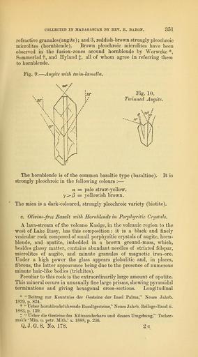 Keywords: The Quarterly journal of the Geological Society of London (13937225462).jpg COLLECTED IN MADAGASCAR BY REV R BAROtf 353 <br> yellow in colour Its crystals are remarkably well contoured ; they <br> are bounded by faces out of the prismatic zone terminated by a <br> dome or hemipyramid <br> Large pseudomorphs after hornblende occur sporadically They <br> are crowded with minute cubes of iron-ore distributed uniformly <br> through the crystal-section see fig 11 Between crossed nicols <br> Fig 11 ” Fused Hornblende-crystal recrystallized as Magnetite <br> and Augite in Magma-basalt X 70 <br> they usually give aggregate-polarization The polarizing substance <br> resembles augite probably produced by a melting-down of the <br> hornblende substance <br> A few grains of quartz similar to those already described are met <br> with occasionally The corroded grains are surrounded by a zone <br> of colourless glass containing augite-microlites ; this is succeeded by <br> a second zone of brown glass containing microlites and crystals of <br> augite together with granules of magnetite see fig 12 <br> Fig 12 ” Quartz-grain melted down and surrounded by light and <br> dark zones of Glass ivith Augite-microlites <br> The amount of glass increases in certain parts of the rock The <br> elongated shape of these more yitreous portions points to fluidal <br> movements during the hardening of the rock The central portions <br> of these patches are often filled with a network of minute opaque <br> trichites crossing one another at angles of 60° 90° and 120° fig 13 <br> Felspar-free basalts or magma-basalts Boficky have a wide-spread <br> occurrence They have been described for instance from the <br> Kaiserstuhl Rosenbusch the Ehon and Vogelsberg Bucking <br> 2c2 36940166 113696 51125 Page 351 Text 45 http //www biodiversitylibrary org/page/36940166 1889 Geological Society of London Biodiversity Heritage Library The Quarterly journal of the Geological Society of London v 45 1889 Geology Periodicals Smithsonian Libraries bhl page 36940166 dc identifier http //biodiversitylibrary org/page/36940166 smithsonian libraries Information field Flickr posted date ISOdate 2014-04-21 Check categories 2015 August 26 CC-BY-2 0 BioDivLibrary https //flickr com/photos/61021753 N02/13937225462 2015-08-26 05 52 28 cc-by-2 0 PD-old-70-1923 The Quarterly journal of the Geological Society of London 1889 Photos uploaded from Flickr by Fæ using a script |