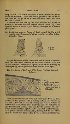 Keywords: The Quarterly journal of the Geological Society of London (13935640122).jpg 1866 <br> FISHEK WAEP <br> 557 <br> so up the hill The drifted fragment is much distorted but never- <br> theless not scattered There are similar patches of this bed in the <br> trail in an old Crag-pit on the Saxmundham road about a mile and a <br> half from Aldborough <br> A similar case was seen by Mr Boyd Dawkins and myself at <br> Walton-on-the-Naze where an angular lump of London Clay about <br> eighteen inches in diameter was entirely enveloped in a mass of <br> gravelly trail <br> Fig 5 ” Section across a furrow of Trail covered hy Warp left <br> standing after the removal of the surrounding gravel for ballast <br> Wivenhoe Essex <br> a Warp <br> b Trail <br> The position of the pebbles in the trail and still more so the con- <br> torted but unscattered condition of incoherent material show that <br> the trail has been transported in a plastic state as mud moving by <br> its own gravity or else pressed onwards by some other agent <br> Fig 6 ” Section of Trail near Villa Farm Tendring Hundred <br> Railway <br> vj - v – ; - _; - a Warp <br> ;V«/; ' - V ' ' ;'f - b Trail of sandy gravel <br> ;;r - 0;'i - '-V;- v \-v ;T;- 3; ˘ London clay <br> d Weathered surface of <br> London clay full of <br> Slickensides <br> I can cite instances which prove that considerable force has been <br> involved in this process In a railway- cutting near Wivenhoe <br> in Essex I found at the side of a valley one of these farrows in <br> London clay about 13 feet deep filled with such sand and gravel as <br> caps the tableland around The clay for the thickness of 4 or 5 <br> inches was kneaded into a plastic state laminated and full through- <br> out of polished surfaces of slickensides showing that the trail which <br> filled the furrow had been pushed forwards under great pressure 36165010 111477 51125 Page 557 Text v 22 http //www biodiversitylibrary org/page/36165010 1866 Geological Society of London Biodiversity Heritage Library The Quarterly journal of the Geological Society of London v 22 1866 Geology Periodicals Smithsonian Libraries bhl page 36165010 dc identifier http //biodiversitylibrary org/page/36165010 smithsonian libraries Information field Flickr posted date ISOdate 2014-04-21 Check categories 2015 August 26 CC-BY-2 0 BioDivLibrary https //flickr com/photos/61021753 N02/13935640122 2015-08-26 06 52 40 cc-by-2 0 PD-old-70-1923 The Quarterly journal of the Geological Society of London 1866 Photos uploaded from Flickr by Fæ using a script |