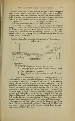 | Keywords: The Quarterly journal of the Geological Society of London (13860114003).jpg PEOP C LAPWOETH ON THE GIEVAX SUCCESSION <br> 657 <br> Between these beds and the southern margin of the overlapping <br> strata of the Lower Carboniferous to the north beds of flagstone <br> varying from a foot to a few inches in thickness and separated by <br> seams of striped blue and grey shales are seen at several spots in the <br> Lady Burn ; they are occasionally fossiliferous affording <br> Cyrtoceras sp j Monograptus vomerinus Kick <br> Orthoceras subundulatuin Portl \ Fleiningii Salt <br> It is doubtful if any of these beds actually belong to the Bargany <br> group of the area last described though they greatly remind us of <br> the strata of that group in their general features They clearly <br> belong both physically and geologically however to the same <br> general series as the Bargany beds possibly following them in the <br> natural order of succession <br> Pig 30 ” General Section of the Silurian beds of Knockgardn r <br> and Straiton <br> ySira-ilon- Grits <br> 7fnocl gtxrdjier and JBlazr <br> S a-lti and fULqslor cs <br> D Dailly Series <br> Db Straiton beds <br> d Straiton purplish conglomerate grits and flags <br> c Thin-bedded shaly flags with Beyrichia KJoedeni Knock- <br> gardner beds <br> b Grey flags and shales Blair beds <br> a Olive-coloured non-fossiliferous flags and shales Drumyork <br> 4 Knoclcgardner and Straiton fig 30 ” The flaggy strata of the <br> three subzones of the Blair beds range from this point eastward to <br> the village of Straiton a distance of at least 3± miles running <br> strictly parallel with the Bargany fault to the southward In the <br> course of a small stream descending the north slope of Benan Hill a <br> mile south-west of Straiton the cold olive-green flags of Drumyork are <br> again seen in contact with the Old Red Sandstone The more finely <br> laminated strata of Blair Farm are exposed in quarries at the farm- <br> steading of Knockgardner where they are crowded with Beyrichia <br> Kloedeni M'Coy and yield a few scattered examples of characteristic <br> Blair fossils Pterinea pleuroptera Conr Orthonota truncata Conr <br> c and indeterminate species of Cyrtograptus and Monograptus <br> The same beds are seen further east in the banks of the Cawin <br> Burn Of the most northerly or highest zone of the Blair beds <br> only a short section is seen in the streams running down the peaty <br> region north of Shaw's Knowes 36936486 113692 51125 Page 657 Text 38 http //www biodiversitylibrary org/page/36936486 1882 Geological Society of London NameFound Beyrichia NameConfirmed Beyrichia EOLID 13110271 NameBankID 3435888 NameFound Cyrtoceras NameConfirmed Cyrtoceras EOLID 4783065 NameBankID 3426667 NameFound Cyrtograptus NameConfirmed Cyrtograptus NameBankID 4134944 NameFound Monograptus NameConfirmed Monograptus EOLID 4724831 NameBankID 4247149 NameFound Monograptus vomerinus NameConfirmed Monograptus vomerinus NameFound Orthoceras NameConfirmed Orthoceras EOLID 30106 NameBankID 1861424 NameFound Orthonota truncata NameConfirmed Batonota truncata NameBankID 2941962 NameFound Pterinea pleuroptera Biodiversity Heritage Library The Quarterly journal of the Geological Society of London v 38 1882 Geology Periodicals Smithsonian Libraries bhl page 36936486 dc identifier http //biodiversitylibrary org/page/36936486 smithsonian libraries Information field Flickr posted date ISOdate 2014-04-15 Check categories 2015 August 26 CC-BY-2 0 BioDivLibrary https //flickr com/photos/61021753 N02/13860114003 2015-08-26 07 51 24 cc-by-2 0 PD-old-70-1923 The Quarterly journal of the Geological Society of London 1882 Photos uploaded from Flickr by Fæ using a script |