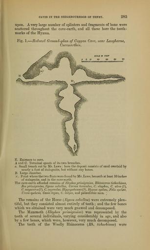 | Keywords: The Quarterly journal of the Geological Society of London (13859838795).jpg CAYES IN THE NEIGHBOURHOOD OE TENBY <br> 283 <br> upon A very large number of splinters and fragments of bone were <br> scattered throughout the cave-earth and all these bore the tooth- <br> marks of the Hysena <br> Fig l ” Reduced Ground-plan of Coygan Cave near LaugJiarne <br> CaermartJien <br> SCALE OF FEET <br> E Entrance to cave <br> A and 0 Terminal spouts of its two branches <br> a Small trench cut by Mr Laws here the deposit consists of sand overlaid by <br> nearly a foot of stalagmite but without any bones <br> B Large chamber <br> X Point where the two flints were found by Mr Laws beneath at least 10 inches <br> of stalagmite and in the cave-earth <br> The cave-earth afforded remains of Elephas primigenius Rhinoceros tichorhinus <br> Bos primigenius Equus caballus Cermis tarandus C elaphus C a Ices <br> C megaceros C capreolus Hippopotamus Hyana spelcea Felis spelaa <br> Ursus spelcsus Cains lupus C vulpes and palaeolithic man ~ <br> The remains of the Horse Equu caballus were extremely plen- <br> tiful but they consisted almost entirely of teeth ; and the few bones <br> which we obtained were very much gnawed and decomposed <br> The Mammoth Elephas primigenius was represented by the <br> teeth of several individuals varying considerably iu age and also <br> by a few bones which were however very much decomposed <br> The teeth of the Woolly Rhinoceros Rh tichorhinus were 36936070 113692 51125 Page 283 Text 38 http //www biodiversitylibrary org/page/36936070 1882 Geological Society of London NameFound Bos primigenius NameConfirmed Bos primigenius EOLID 11021570 NameBankID 2813453 NameFound Elephas primigenius NameConfirmed Elephas primigenius NameBankID 5716812 NameFound Equus caballus NameConfirmed Equus caballus EOLID 10194583 NameBankID 2478626 NameFound Ursus NameConfirmed Ursus EOLID 14349 NameBankID 2478080 Biodiversity Heritage Library The Quarterly journal of the Geological Society of London v 38 1882 Geology Periodicals Smithsonian Libraries bhl page 36936070 dc identifier http //biodiversitylibrary org/page/36936070 smithsonian libraries Information field Flickr posted date ISOdate 2014-04-15 Check categories 2015 August 26 CC-BY-2 0 BioDivLibrary https //flickr com/photos/61021753 N02/13859838795 2015-08-26 07 52 05 cc-by-2 0 PD-old-70-1923 The Quarterly journal of the Geological Society of London 1882 Photos uploaded from Flickr by Fæ using a script |