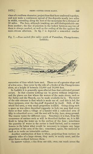 Keywords: The Quarterly journal of the Geological Society of London (13369159353).jpg 1873 <br> DREW UPPER-INDUS BASIN <br> 449 <br> vines of a uniform character project fans that have coalesced together <br> and now make a continuous spread of fan-deposits nearly two miles <br> in width extending along the foot of the mountains for a distance of <br> 30 miles The fans although touching are still distinguishable one <br> from another ; the line of junction in the hollow between any two of <br> them is always marked as well as the ending of the fan against the <br> main- stream alluvium In fig 7 is depicted a somewhat similar <br> Fig 7 Fans united five miles south of Pamzalan Changchenmo <br> Ladakh <br> succession of fans which have met These are of a greater slope and <br> of a less area ; they occur by the side of a feeder of the Changchenmo <br> river at a height of between 15 000 and 16 000 feet <br> In Ladakh it is generally upon alluvial fans that cultivated ground <br> occurs In that country nothing can be grown without irrigation ; <br> and the places are few where the waters of the main rivers such as <br> the Indus and the Shayok can be made available for it The water <br> of the side streams is that which is made use of ; and this is led for <br> these purposes over the fan-stuff deposited by itself Still of the <br> whole fan-area a very small proportion is tilled Going along such <br> a space as was above described opposite to Leh we may find every <br> three or four miles a village or a hamlet with a cultivated area of <br> fifty to a hundred acres ; and the rest will be dry bare stony ground <br> The reason varies for different cases Sometimes it is that from the <br> occurrence of ravines such as will be described further on it is dif- <br> ficult to bring the water on to the surface of the fans ; sometimes <br> the quantity of water in the ravine is itself limited and in summer <br> lessens to far below what would be necessary to irrigate any large <br> proportion of the area of the fan ; sometimes again the material is <br> such as to make an intractable surface <br> Another combination of fans is when projecting from ravines on <br> opposite sides of a large stream they meet or nearly meet and the <br> river flows confined between them <br> In narrow valleys a fan from one side even can reach across the 39051387 120601 51125 Page 449 Text v 29 http //www biodiversitylibrary org/page/39051387 1873 Geological Society of London Biodiversity Heritage Library The Quarterly journal of the Geological Society of London v 29 1873 Geology Periodicals Smithsonian Libraries bhl page 39051387 dc identifier http //biodiversitylibrary org/page/39051387 smithsonian libraries Information field Flickr posted date ISOdate 2014-03-24 Check categories 2015 August 26 CC-BY-2 0 BioDivLibrary https //flickr com/photos/61021753 N02/13369159353 2015-08-26 10 55 52 cc-by-2 0 PD-old-70-1923 The Quarterly journal of the Geological Society of London 1873 Photos uploaded from Flickr by FĂŚ using a script |
