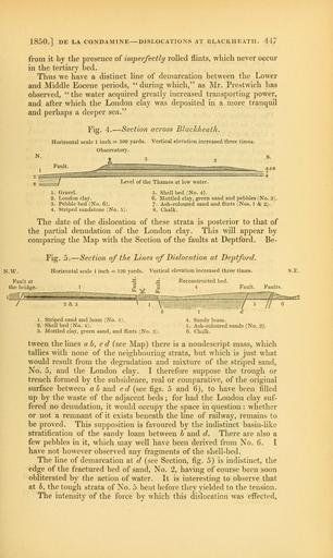 | Keywords: The Quarterly journal of the Geological Society of London (13365623973).jpg 1850 DE LA CONDAMINE ” DISLOCATIONS AT ELACKHEATH 44/ <br> from it by the presence of imiierfectly rolled flints which never occur <br> in the tertiary bed <br> Thus we have a distinct line of demarcation between the Lower <br> and Middle Eocene periods during which as Mr Prestwich has <br> observed the water acquired greatly increased transporting power <br> and after which the London clay was deposited in a more tranquil <br> and perhaps a deeper sea <br> Fig 4 ” Section across Blackheath <br> Horizontal scale 1 inch 500 yards Vertical elevation increased three times <br> Observatory <br> 8 Si \4S«W»WW <br> 1 Gravel <br> 2 London clay <br> 3 Pebble bed No 6 <br> 4 Striped sandstone No 5 <br> 5 Shell bed No 4 <br> 6 Mottled clay green sand and pebbles No 3 <br> 7 Ash-coloured sand and flints Nos 1 2 <br> 8 Chalk <br> N W <br> The date of the dislocation of these strata is posterior to that of <br> the partial denudation of the London clay This will appear by <br> comparing the Map with the Section of the faults at Deptford Be- <br> Fig 5 ” Section of the Lines of Dislocation at Deptford <br> Horizontal scale 1 inch 120 yards Vertical elevation increased three times S E <br> ii Reconstructed bed <br> g 4 Fault Faults <br> 1 Striped sand and loam No 5 <br> 2 SheUbed No 4 <br> 3 Mottled clay green sand and flints No 3 <br> 4 Sandy loam <br> 5 Ash-coloured sands No 2 <br> 6 Chalk <br> tween the lines ah cd Csee Map there is a nondescript mass which <br> tallies with none of the neighbouring strata but which is just what <br> would result from the degradation and mixture of the striped sand <br> No 5 and the London clay I therefore suppose the trough or <br> trench formed by the subsidence real or comparative of the original <br> surface between a h and c d see figs 5 and 6 to have been filled <br> up by the waste of the adjacent beds ; for had the London clay suf- <br> fered no denudation it would occupy the space in question whether <br> or not a remnant of it exists beneath the line of railway remains to <br> be proved This supposition is favoured by the indistinct basin-like <br> stratification of the sandy loam between h and d There are also a <br> few pebbles in it which may well have been derived from No 6 I <br> have not however observed any fragments of the shell-bed <br> The line of demarcation at d see Section fig 5 is indistinct the <br> edge of the fractured bed of sand No 2 having of course been soon <br> obliterated by the action of water It is interesting to observe that <br> at 6 the tough strata of No 5 bent before they yielded to the tension <br> The intensity of the force by which this dislocation was effected 36934318 113689 51125 Page 447 Text v 6 http //www biodiversitylibrary org/page/36934318 1850 Geological Society of London Biodiversity Heritage Library The Quarterly journal of the Geological Society of London v 6 1850 Geology Periodicals Smithsonian Libraries bhl page 36934318 dc identifier http //biodiversitylibrary org/page/36934318 smithsonian libraries Information field Flickr posted date ISOdate 2014-03-23 Check categories 2015 August 26 CC-BY-2 0 BioDivLibrary https //flickr com/photos/61021753 N02/13365623973 2015-08-26 10 51 54 cc-by-2 0 PD-old-70-1923 The Quarterly journal of the Geological Society of London 1850 Photos uploaded from Flickr by Fæ using a script |