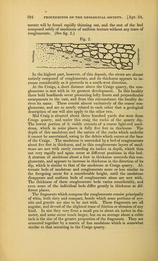 | Keywords: The Quarterly journal of the Geological Society of London (13365798124).jpg  of one will also apply to the other two <br> Mid Craig is situated about three hundred yards due west from <br> Craigs quarry and under this craig the rocks of the quarry dip <br> The lowest portion of it visible consists of a coarse light-red sand- <br> stone which in some places is fully five feet in thickness The <br> depth of this sandstone and the nature of the rocks which underlie <br> it cannot be ascertained owing to the debris which occurs at the base <br> of the Craigs The sandstone is succeeded by a bed of conglomerate <br> about five feet in thickness and in this conglomerate layers of sand- <br> stone are met with rarely exceeding six inches in depth which thin <br> out very rapidly and again occur at different positions in this bed <br> A stratum of sandstone about a foot in thickness succeeds this con- <br> glomerate and appears to increase in thickness in the direction of its <br> dip which is similar to that of the sandstone at Craigs quarry Al- <br> ternate beds of sandstone and conglomerate more or less similar to <br> the foregoing occur for a considerable height until the sandstone <br> disappears and uniform beds of conglomerate alone are met with <br> The thickness of these conglomerate beds varies considerably and <br> even some of the individual beds differ greatly in thickness at dif- <br> ferent places <br> The fragments which compose the conglomerate consist principally <br> of whin both slaty and compact beside which some portions of sye- <br> nite and granite are also to be met with These fragments are all <br> angular and devoid of the slightest trace of friction or abrasion of any <br> kind In size they vary from a small pea to about six inches in dia- <br> meter and some occur much larger but on an average about a cubic <br> inch is the size of the greater proportion of the fragments They are <br> cemented together by a matrix of fine sandstone which is somewhat <br> similar to that occurring in the Craigs quarry 36934263 113689 51125 Page 394 Text v 6 http //www biodiversitylibrary org/page/36934263 1850 Geological Society of London Biodiversity Heritage Library The Quarterly journal of the Geological Society of London v 6 1850 Geology Periodicals Smithsonian Libraries bhl page 36934263 dc identifier http //biodiversitylibrary org/page/36934263 smithsonian libraries Information field Flickr posted date ISOdate 2014-03-23 Check categories 2015 August 26 CC-BY-2 0 BioDivLibrary https //flickr com/photos/61021753 N02/13365798124 2015-08-26 10 52 52 cc-by-2 0 PD-old-70-1923 The Quarterly journal of the Geological Society of London 1850 Photos uploaded from Flickr by Fæ using a script |