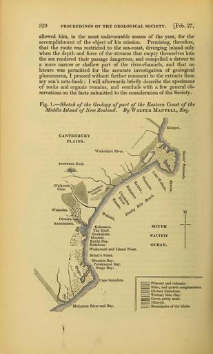 Keywords: The Quarterly journal of the Geological Society of London (13365478153).jpg 320 <br> PROCEEDINGS OF THE GEOLOGICAL SOCIETY Feb 27 <br> allowed him in the most unfavourable season of the year for the <br> accomplishment of the object of his mission Premising therefore <br> that the route was restricted to the sea-coast diverging inland only <br> when the depth and force of the streams that empty themselves into <br> the sea rendered their passage dangerous and compelled a detour to <br> a more narrow or shallow part of the river-channels and that no <br> leisure was permitted for the accurate investigation of geological <br> pheenomena I proceed without farther comment to the extracts from <br> my son's note-book I will afterwards briefly describe the specimens <br> of rocks and organic remains and conclude with a few general ob- <br> servations on the facts submitted to the consideration of the Society <br> Fig 1 ” Sketch of the Geology of part of the Eastern Coast of the <br> Middle Island of New Zealand By Walter Mantell Esq <br> Kaiapoi <br> CANTERBURY <br> PLAINS <br> Arowenua Bush <br> Waiareka - <br> Kakaunui <br> Blujl <br> Onekakara <br> Bloeraki <br> Katiki Bay <br> Matakaea <br> Waikouaiti and Island Point <br> Brinn's Point <br> Blueskin Bay <br> Purakaunui Bay <br> Otago Bay <br> Cape Saunders <br> Molyneux River and Bay <br> Pvi M Primary and volcanic <br> I//////// Slate and quartz conglomerate <br> \; i y c Ototara limestone <br> l- ' Tertiary blue clay <br> Bmssm; Green gritty marl <br> nn M Diluvial <br> lijdlli Boundaries of the block 36934181 113689 51125 Page 320 Text v 6 http //www biodiversitylibrary org/page/36934181 1850 Geological Society of London Biodiversity Heritage Library The Quarterly journal of the Geological Society of London v 6 1850 Geology Periodicals Smithsonian Libraries bhl page 36934181 dc identifier http //biodiversitylibrary org/page/36934181 smithsonian libraries Information field Flickr posted date ISOdate 2014-03-23 Check categories 2015 August 26 CC-BY-2 0 BioDivLibrary https //flickr com/photos/61021753 N02/13365478153 2015-08-26 11 59 14 cc-by-2 0 PD-old-70-1923 The Quarterly journal of the Geological Society of London 1850 Photos uploaded from Flickr by Fæ using a script |