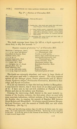 | Keywords: The Quarterly journal of the Geological Society of London (13365363203).jpg 1850 PRESTWICH ON THE LOWER TERTIARY STRATA <br> 257 <br> Fig 2 Section at Clarendon Hill <br> s <br> a Ochreous flint gravel <br> b liondon clay ; dark bluish grey sandy clays with nume- <br> rous PanopcscB OstrecB and Finnce <br> Cc Large tabular masses ; composed some of almost <br> I a pure green sand and others of a coarse ochreous <br> N sand with a calcareous cement A few rather <br> small round flint pebbles are scattered through <br> L these blocks <br> d Alternating thin beds of sand and thick beds of <br> mottled clay ; chiefly red <br> The chalk outcrops lower down the hill at a depth apparently of <br> ahout forty to fifty feet beneath c <br> Organic remains of stratum c at Clarendon Hill <br> Buccinum ' ambiguura Desk <br> n sp large and globose <br> Cancellaria Iseviuscula Desk <br> Cardiura nitens Sow <br> n sp a <br> Corbula longirostris Desk <br> Cytherea obliqua Desk <br> ovalis var Sow <br> laevigata var a Lamk <br> Ditrupa plana Sow sp <br> Fusus tuberosus Sow <br> n sp witb plain costse <br> n sp large and smooth <br> Natica glaucinoides Sov <br> Hantoniensis Pilk <br> Nucula a small species <br> Ostrea large undetermined species <br> Pectimculus brevirostris Sow <br> Plumsteadiensis Sow <br> Pyrula tricostata Desk <br> Pleurotoma comma Sow <br> Rostellaria Sowerbyi Mant <br> Tellina <br> Turritella <br> Teeth of Lamnae <br> Carbonized pieces of wood <br> The fossils are extremely abundant and occur in large blocks of <br> clay and green sand with a calcareous cement The most common <br> species are the Ditrupa plana Natica glaucinoides and N Hanto- <br> niensis Cytherea obliqua Pectunculus brevirostris Rostellaria Sow- <br> erbyi and Fyrula tricostata <br> It is not my intention to trace this bed any further in Hampshire <br> I may however observe that I there know of no other good section <br> of it I have seen it but not well exhibited at Padnell in Bere <br> Forest and also on the railway near Fareham <br> Crossing the intervening chalk district to the most westerly ex- <br> tension of the London tertiaries the first point where we meet with <br> some uncertain indications without sections of the basement bed of <br> the London clay is capping the summit of Bagshot Hill between <br> Great Bedwin and Hungerford It is better exposed between Hunger- <br> ford and Newbury near the summit of Pebble Hill one mile south <br> of Kintbury See fig 3 <br> This and the following sections figs 2 to 20 are all drawn upon the same <br> scale ; viz 1 inch represents a thickness of 20 feet Section fig 1 is an exception <br> to the rule It is the fig given in the Journal of the Society vol iii p 362 and <br> is upon a much larger scale <br> u 2 36934112 113689 51125 Page 257 Text v 6 http //www biodiversitylibrary org/page/36934112 1850 Geological Society of London NameFound Buccinum NameConfirmed Buccinum EOLID 10712522 NameBankID 2685510 NameFound Cancellaria NameConfirmed Cancellaria EOLID 58466 NameBankID 241557 NameFound Cardiura nitens NameFound Corbula longirostris NameConfirmed Corbula longicostata Yu Li 1982 NameBankID 6881255 NameFound Cytherea obliqua NameFound Ditrupa plana NameConfirmed Ditrupa plana NameFound Fusus tuberosus NameConfirmed Fusus tuberosus Reeve 1847 NameFound Fyrula tricostata NameFound Iseviuscula NameFound Natica glaucinoides NameFound Nucula NameConfirmed Nucula EOLID 10719654 NameBankID 2691879 NameFound Ostrea NameConfirmed Ostrea EOLID 10719983 NameBankID 2692450 NameFound Pectimculus brevirostris NameConfirmed Pectunculus brevirostris Sowerby 1824 NameBankID 6464542 NameFound Pectunculus brevirostris NameConfirmed Pectunculus brevirostris NameBankID 6464541 NameFound Pleurotoma comma NameConfirmed Pleurotoma comma NameBankID 6193733 NameFound Plumsteadiensis NameFound Pyrula tricostata NameFound Rostellaria NameConfirmed Rostellaria EOLID 4873050 NameBankID 3940657 NameFound Tellina NameConfirmed Tellina EOLID 50297 NameBankID 2693370 NameFound Turritella NameConfirmed Turritella EOLID 52187 NameBankID 2683895 Biodiversity Heritage Library The Quarterly journal of the Geological Society of London v 6 1850 Geology Periodicals Smithsonian Libraries bhl page 36934112 dc identifier http //biodiversitylibrary org/page/36934112 smithsonian libraries Information field Flickr posted date ISOdate 2014-03-23 Check categories 2015 August 26 CC-BY-2 0 BioDivLibrary https //flickr com/photos/61021753 N02/13365363203 2015-08-26 11 50 52 cc-by-2 0 PD-old-70-1923 The Quarterly journal of the Geological Society of London 1850 Photos uploaded from Flickr by FĂŚ using a script |