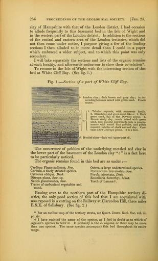 | Keywords: The Quarterly journal of the Geological Society of London (13365219685).jpg  256 <br> PROCEEDINGS OF THE GEOLOGICAL SOCIETY Jan 23 <br> clay of HampsMre \ritli that of the London district I had occasion <br> to allude frequently to this basement bed in the Isle of Wight and <br> in the western part of the London district In addition to the sections <br> of the central and eastern area of the London tertiaries which did <br> not then come under notice I pm-pose gi 'ing a few of the leading <br> sections I then alluded to in more detail than I could in a paper <br> which embraced a wider subject and to which this point was only <br> secondaiy <br> I will take separately the sections and lists of the organic remains <br> at each locahty and afterwards endeavour to show their co-relation <br> To resume m the Isle of \M2;ht with the interesting section of this <br> bed at White Cliff Bay See fig 1 <br> Fig \ ” Section of a part of White ClifBay <br> b London clay ; dark brown and grey clay ; in de- <br> scending becomes mixed ith green sand Fossils <br> scarce <br> Tabular septaria with numerous fossUs <br> 2 IMised clay and green sand like 4 3 Dark <br> green sand full of the Ditrupa playia 4 <br> Brown sandy clay much mixed with green <br> sand and passing downwards into a conglo- <br> merate with round flint pebbles and partly <br> rounded pebbles of chalk and red clay Con- <br> tains a few Ditrupa plana 3 to 4 feet <br> c <br> Ostrea a large undetermined species <br> Pectunculus brevirostris Sow <br> Pyrula tricostata Desk <br> Rostellaria Sowerbyi Mant <br> Teeth of Lamnaef <br> Mottled clays ” dark red upper part of <br> The occurrence of pebbles of the underhung mottled red clay m <br> the lower part of the basement of the London clay c is a fact here <br> to be particularly noticed <br> The organic remains found in this bed are as under ” <br> Cardium Plumsteadiense Sow <br> Corbula a finely striated species <br> Cytherea obliqua Desk <br> Ditrupa plana Sow sp <br> Natica glaucinoides Sow <br> Traces of carbonized yegetables and <br> wood <br> Passing over to the northern part of the Hampshire tertiary di- <br> strict the only good section of this bed that I am acquainted with <br> was exposed in a cutting on the Railway at Clarendon Hill three miles <br> E S E of Sahsbuiy See fig 2 <br> For an outline map of the tertiary strata see Quart Joum Geol Soc vol iii <br> pi xiv <br> t I have omitted the name of the species as I feel in doubt as to which of <br> Agassiz's species to refer it It probably is the L elegans or there may be more <br> than one species The same species accompany tliis bed throughout its entire <br> range 36934111 113689 51125 Page 256 Text v 6 http //www biodiversitylibrary org/page/36934111 1850 Geological Society of London NameFound Cardium NameConfirmed Cardium EOLID 50301 NameBankID 2693257 NameFound Corbula NameConfirmed Corbula EOLID 56976 NameBankID 2693839 NameFound Cytherea obliqua NameFound Ditrupa NameConfirmed Ditrupa EOLID 52269 NameBankID 2552122 NameFound Ditrupa plana NameConfirmed Ditrupa plana NameFound Lamna elegans NameConfirmed Lamna elegans NameFound Natica glaucinoides NameFound Ostrea NameConfirmed Ostrea EOLID 10719983 NameBankID 2692450 NameFound Pectunculus brevirostris NameConfirmed Pectunculus brevirostris NameBankID 6464541 NameFound Pyrula tricostata NameFound Rostellaria NameConfirmed Rostellaria EOLID 4873050 NameBankID 3940657 Biodiversity Heritage Library The Quarterly journal of the Geological Society of London v 6 1850 Geology Periodicals Smithsonian Libraries bhl page 36934111 dc identifier http //biodiversitylibrary org/page/36934111 smithsonian libraries Information field Flickr posted date ISOdate 2014-03-23 Check categories 2015 August 26 CC-BY-2 0 BioDivLibrary https //flickr com/photos/61021753 N02/13365219685 2015-08-26 11 57 17 cc-by-2 0 PD-old-70-1923 The Quarterly journal of the Geological Society of London 1850 Photos uploaded from Flickr by Fæ using a script |