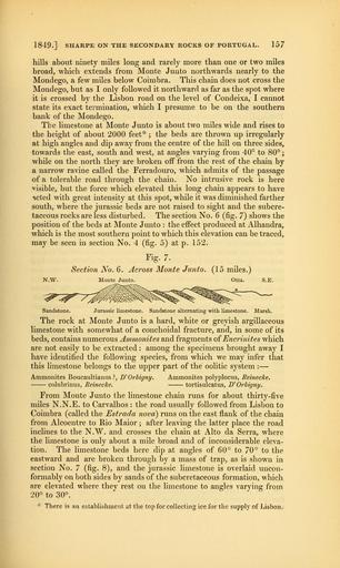 | Keywords: The Quarterly journal of the Geological Society of London (13365430884).jpg 1849 SHARPE ON THE SECONDARY ROCKS OF PORTUGAL 157 <br> hills about ninety miles long and rarely more than one or two miles <br> broad which extends from Monte Junto northwards nearly to the <br> Mondego a few miles below Coimbra This chain does not cross the <br> Mondego but as I only followed it northwarrl as far as the spot where <br> it is crossed by the Lisbon road on the level of Condeixa I cannot <br> state its exact termination which I presume to be on the southern <br> bank of the Mondego <br> The limestone at Monte Junto is about two miles wide and rises to <br> the height of about 2000 feet ; the beds are thrown up irregularly <br> at high angles and dip away from the centre of the hill on three sides <br> towards the east south and west at angles varying from 40 to 80° ; <br> while on the north they are broken oif from the rest of the chain by <br> a narrow ravine called the Ferradouro which admits of the passage <br> of a tolerable road through the chain No intrusive rock is here <br> visible but the force which elevated this long chain appears to have <br> acted with great intensity at this spot while it was diminished farther <br> south where the Jurassic beds are not raised to sight and the subcre- <br> taceous rocks are less disturbed The section No 6 fig 7 shows the <br> position of the beds at Monte Junto the effect produced at Alhandra <br> which is the most southern point to which this elevation can be traced <br> may be seen in section No 4 fig 5 at p 152 <br> Fig 7 <br> Section No 6 Across Monte Junto 15 miles <br> N W Monte Junto Otta S E <br> Sandstone Jurassic limestone Sandstone alternating with limestone Marsh <br> The rock at Monte Junto is a hard white or greyish argillaceous <br> limestone with somewhat of a conchoidal fracture and in some of its <br> beds contains numerous A nmonites and fragments of Enc 'inites which <br> are not easily to be extracted among the specimens brought away I <br> have identified the following species from which we may infer that <br> this limestone belongs to the upper part of the oolitic system ” <br> Ammonites Boucaultiamis ' D'Oriigny Ammonites polyplocus Reinecke <br> colubrinus Reinecke tortisuleatus B Orhigny <br> From Monte Junto the limestone chain runs for about thirty-five <br> miles N N E to Carvalhos the road usually followed from Lisbon to <br> Coimbra called the Estrada nova runs on the east flank of the chain <br> from Alcoentre to Rio Maior ; after leaving the latter place the road <br> inclines to the N W and crosses the chain at Alto da Serra where <br> the limestone is only about a mile broad and of inconsiderable eleva- <br> tion The limestone beds here dip at angles of 60° to 70° to the <br> eastward and are broken through by a mass of trap as is shown in <br> section No 7 fig 8 and the Jurassic limestone is overlaid uncon- <br> formably on both sides by sands of the subcretaceous formation which <br> are elevated where they rest on the limestone to angles varying from <br> 20° to 30° <br> There is an establishment at the top for collecting ice for the supply of Lisbon 36933982 113689 51125 Page 157 Text v 6 http //www biodiversitylibrary org/page/36933982 1850 Geological Society of London NameFound AmMONITES polyplocus NameFound Boucaultiamis NameFound Estrada nova NameFound Maior NameConfirmed Maior NameBankID 5332597 Biodiversity Heritage Library The Quarterly journal of the Geological Society of London v 6 1850 Geology Periodicals Smithsonian Libraries bhl page 36933982 dc identifier http //biodiversitylibrary org/page/36933982 smithsonian libraries Information field Flickr posted date ISOdate 2014-03-23 Check categories 2015 August 26 CC-BY-2 0 BioDivLibrary https //flickr com/photos/61021753 N02/13365430884 2015-08-26 12 01 27 cc-by-2 0 PD-old-70-1923 The Quarterly journal of the Geological Society of London 1850 Photos uploaded from Flickr by Fæ using a script |