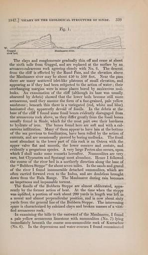 | Keywords: The Quarterly journal of the Geological Society of London (13206068703).jpg 184/ VICARY ON THE GEOLOGICAL STRUCTURE OF SINDE 339 <br> Fig 1 <br> The clays and conglomerate gradually thin off and cease at about <br> the sixth mile from Guggul and are replaced at the surface by an <br> arenaceo-calcareous rock agreeing closely with No 6 The descent <br> from the cliff is effected by the Rund Pass and the elevation above <br> the Maulmaree river may be about 450 to 500 feet Near the pass <br> there are many scattered islet-like plateaux of small elevation and <br> appearing as if they had been subjected to the action of water ; their <br> overhanging margins were in some places bored by saxicavous mol- <br> lusks An examination of the cliff although its base was usually <br> obscured by debris showed that the lower beds become still more <br> arenaceous until they assume the form of a fine-grained pale yellow <br> sandstone ; beneath this there is a variegated red white and blue <br> laminated clay apparently devoid of fossils In the debris at the <br> base of the cliff I found some fossil bones evidently disengaged from <br> the arenaceous rock above as they differ greatly from the fossil bones <br> usually fomid in Sinde which for the most part owe their hardness <br> to hydrate of iron The bones found here are soft and with a cal- <br> careous infiltration Many of them appear to have lain at the bottom <br> of the sea previous to fossilization have been rolled by the action of <br> currents and are occasionally pierced by boring mollusks The fossil <br> most abundant in the lower part of this rock is an Ostrea with the <br> upper valve flat and smooth the lower concave and costate and <br> evidently a gregarious species A very large Pectenalso occurs upon <br> which I shall make some remarks hereafter Nummulites are very <br> rare but Clypeastra and Spatangi most abundant Hence I followed <br> the course of the river bed in a northerly direction along the base of <br> the Bubbera Steppe for about seven miles In the sands and gravel <br> of the river I found innumerable detached nummulites which are <br> often carried forward even to the Indus and are doubtless brought <br> down from the Hala Range The Maulmaree during rain becomes <br> an impetuous and impassable torrent <br> The fossils of the Bubbera Steppe are almost obliterated appa- <br> rently by the former action of heat At the time when the steppe <br> was uplifted a portion of rock about 200 yards in length was left in <br> a mural and almost perpendicular position and is now about sixty <br> yards from the general line of the Bubbera Steppe The intervening <br> space is characterized by calcined clays and broken masses of a vitri- <br> fied arenaceous rock <br> In examining the hills to the eastward of the Maulmaree I found <br> a pale yellow arenaceous limestone with nummulites No 7 lying <br> immediately beneath the coarse non-nummulitic rock of Kurrachee <br> No 6 In the depressions and water-courses I found comminuted 36933098 113687 51125 Page 339 Text v 3 http //www biodiversitylibrary org/page/36933098 1847 Geological Society of London NameFound Hala NameConfirmed Hala EOLID 113195 NameBankID 4551297 NameFound Nummulites NameConfirmed Nummulites EOLID 6817785 NameBankID 3399048 NameFound Ostrea NameConfirmed Ostrea EOLID 10719983 NameBankID 2692450 Biodiversity Heritage Library The Quarterly journal of the Geological Society of London v 3 1847 Geology Periodicals Smithsonian Libraries bhl page 36933098 dc identifier http //biodiversitylibrary org/page/36933098 smithsonian libraries Information field Flickr posted date ISOdate 2014-03-17 Check categories 2015 August 26 CC-BY-2 0 BioDivLibrary https //flickr com/photos/61021753 N02/13206068703 2015-08-26 12 54 28 cc-by-2 0 PD-old-70-1923 The Quarterly journal of the Geological Society of London 1847 Photos uploaded from Flickr by Fæ using a script |