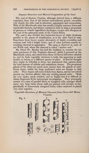 | Keywords: The Quarterly journal of the Geological Society of London (13205846445).jpg  268 <br> PROCEEDINGS OF THE GEOLOGICAL SOCIETY April 14 <br> Organic Structure and Mineral Composition of the Coal <br> The coal of Eastern Virginia although derived from a different <br> vegetation from that of the ancient carhoniferous period resembles <br> very closely the older coal in structure appearance and composition <br> That of the Blackheath mine has usually a highly resinous lustre and <br> conchoidal fracture and always contains at least as large a proportion <br> of gaseous or volatile ingredients hydrogen oxygen and nitrogen as <br> the coal of the palaeozoic rocks of the United States <br> The coal is also divided into horizontal layers of slight thickness <br> parallel to the planes of stratification as in the older kind of coal <br> Sometimes these layers consist alternately of highly crystalline and <br> resinous coal with a bright lustre and of other portions exactly re- <br> sembling charcoal in appearance The same is observed in some of <br> our Welsh coal where the charcoal is called mother coal <br> My friend Dr Hooker has had the kindness to examine for me <br> some specimens of this Virginian charcoal which I procured at the <br> Blackheath mines and others from those of Clover-hill before alluded <br> to and he finds vegetable structure in both but appearing in each <br> locality to belong to a different species of plant At first he thought <br> they might be referable to ferns but abandoned that opinion from <br> the total absence of cellular and scalariform tissues The prominent <br> glands of the fibres are much more minute than the glands of coni- <br> ferous tissue whilst the large perforated tubes are foreign to that <br> order They depart still more widely from Zamia and do not indeed <br> present any obvious affinity with any existing natural order Both <br> are very opake much crushed and so fragile that it is difficult to <br> obtain fragments fit for microscopic investigation They principally <br> consist of a mass of parallel fibres or elongated cells amongst which <br> occur very large tubes whose walls are pierced with circular or lon- <br> gitudinally or transversely elongated holes either scattered or placed <br> very close together <br> Vegetable Structure of Mineral Charcoal from Clover-hill Mines <br> Fig 3 36933007 113687 51125 Page 268 Text v 3 http //www biodiversitylibrary org/page/36933007 1847 Geological Society of London NameFound Zamia NameConfirmed Zamia L 1763 EOLID 11421944 Biodiversity Heritage Library The Quarterly journal of the Geological Society of London v 3 1847 Geology Periodicals Smithsonian Libraries bhl page 36933007 dc identifier http //biodiversitylibrary org/page/36933007 smithsonian libraries Information field Flickr posted date ISOdate 2014-03-17 Check categories 2015 August 26 CC-BY-2 0 BioDivLibrary https //flickr com/photos/61021753 N02/13205846445 2015-08-26 12 54 34 cc-by-2 0 PD-old-70-1923 The Quarterly journal of the Geological Society of London 1847 Photos uploaded from Flickr by Fæ using a script |