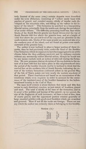 Keywords: The Quarterly journal of the Geological Society of London (13205760615).jpg 182 PROCEEDINGS OF THE GEOLOGICAL SOCIETY Jan 6 <br> terly Journal of the same year certain deposits were described <br> under the term Diluvium consisting of yellow sandy loam with <br> patches of gravel and rounded masses chiefly of insular rock de- <br> veloped on the mountain sides and filling up the valleys in the in- <br> terior of the island This formation he ascribed to a transporting <br> diluvial action principally from the north-east during the prevalence <br> of an arctic climate The difficulty presenting itself was that whilst <br> blocks of the South Barrule granite are found driven over the top of <br> South Barrule 600 feet above the granitic boss and at a height of <br> 1545 feet above the present level of the sea and are plentiful on the <br> south-western side blocks of the same granite are scattered also over <br> the southern area of the island and are found at points even south- <br> eastward of the granitic boss <br> The author is now inclined to place a larger portion of these de- <br> posits than he had previously done under the head of the Boulder <br> Clay formation which he supposes to havebeenaggregatedin an arctic <br> climate belotv the then ordinary sea-level and by ordinary currents <br> without any necessarily violent diluvial action though he would not <br> by any means exclude such an action at intervals during the forma- <br> tion He now presumes that an elevation of the sea-bottom to the ex- <br> tent of at least 400 feet has taken place in this neighbourhood since <br> the period of the boulder deposit and he is inclined to think that the <br> curved line on the southern side of South Barrule indicating the ex- <br> tent of the tertiary formations coloured yellow in his general Map <br> of the Isle of Man points out very nearly the ancient sea-shore of <br> that period These conclusions are based on an examination of the <br> conditions which seem requisite in order to account for the occur- <br> rence of the insulated mass of the boulder formation in the before- <br> mentioned locality in the Calf of Man <br> The mass itself which is about thirteen feet thick and fifty feet <br> across in each direction consists as just stated of boulders gravel <br> and sand The sand is chiefly at the base of the formation and in <br> it occur a few pebbles and laminae of fine gravel ; as we ascend the <br> size of the fragments of rock increases; we have a bed of fine then <br> of coarse gravel and the uppermost portion consists generally of <br> large rounded pebbles with good-sized boulders which are scratched <br> and grooved Most if not all the rocks are foreign There are not <br> any which the author can certainly claim as belonging to this locality <br> Section 4 <br> Ill <br> III <br> P <br> 1 <br> KffiB-55- <br> - _ <br> ~ ' Cj ˘ --;- – <br> - - -- '-- <br> ” 1 <br> ~ S 36932911 113687 51125 Page 182 Text v 3 http //www biodiversitylibrary org/page/36932911 1847 Geological Society of London NameFound Diluvium Biodiversity Heritage Library The Quarterly journal of the Geological Society of London v 3 1847 Geology Periodicals Smithsonian Libraries bhl page 36932911 dc identifier http //biodiversitylibrary org/page/36932911 smithsonian libraries Information field Flickr posted date ISOdate 2014-03-17 Check categories 2015 August 26 CC-BY-2 0 BioDivLibrary https //flickr com/photos/61021753 N02/13205760615 2015-08-26 12 54 08 cc-by-2 0 PD-old-70-1923 The Quarterly journal of the Geological Society of London 1847 Photos uploaded from Flickr by Fæ using a script |