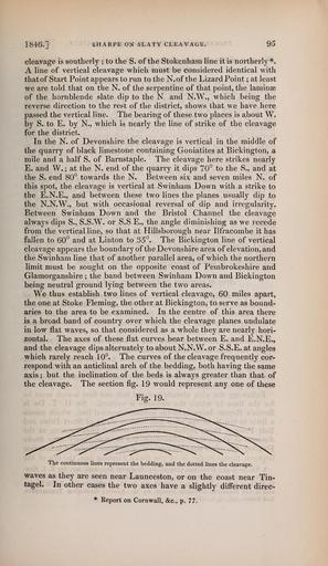 | Keywords: The Quarterly journal of the Geological Society of London (13205826403).jpg 1846 <br> SHARPE ON SLATY CLEAVAGE <br> 95 <br> cleavage is southerly ; to the S of the Stokenham line it is northerly <br> A line of vertical cleavage which must be considered identical with <br> thatof Start Point appears to run to the N of the Lizard Point ; at least <br> we are told that on the N of the serpentine of that point the laminae <br> of the hornblende slate dip to the N and N W which being the <br> reverse direction to the rest of the district shows that we have here <br> passed the vertical line The bearing of these two places is about W <br> by S to E by N which is nearly the line of strike of the cleavage <br> for the district <br> In the N of Devonshire the cleavage is vertical in the middle of <br> the quarry of black limestone containing Goniatites at Bickington a <br> mile and a half S of Barnstaple The cleavage here strikes nearly <br> E and W ; at the N end of the quarry it dips 70° to the S and at <br> the S end 80° towards the N Between six and seven miles N of <br> this spot the cleavage is vertical at Swinham Down with a strike to <br> the E N E and between these two lines the planes usually dip to <br> the N N W but with occasional reversal of dip and irregularity <br> Between Swinham Down and the Bristol Channel the cleavage <br> always dips S S S W or S SE the angle diminishing as we recede <br> from the vertical line so that at Hillsborough near Ilfracombe it has <br> fallen to 60° and at Linton to 35° The Bickington line of vertical <br> cleavage appears the boundary of the Devonshire area of elevation and <br> the Swinham line that of another parallel area of which the northern <br> limit must be sought on the opposite coast of Pembrokeshire and <br> Glamorganshire ; the band between Swinham Down and Bickington <br> being neutral ground lying between the two areas <br> We thus establish two lines of vertical cleavage 60 miles apart <br> the one at Stoke Fleming the other at Bickington to serve as bound- <br> aries to the area to be examined In the centre of this area there <br> is a broad band of country over which the cleavage planes undulate <br> in low flat waves so that considered as a whole they are nearly hori- <br> zontal The axes of these flat curves bear between E and E N E <br> and the cleavage dips alternately to about N N W or S S E at angles <br> which rarely reach 10° The curves of the cleavage frequently cor- <br> respond with an anticlinal arch of the bedding both having the same <br> axis ; but the inclination of the beds is always greater than that of <br> the cleavage The section fig 19 would represent any one of these <br> Fig 19 <br> The continuous lines represent the bedding and the dotted lines the cleavage <br> waves as they are seen near Launceston or on the coast near Tin- <br> tagel In other cases the two axes have a slightly difl'erent direc- <br> Report on Cornwall c p 77 36932824 113687 51125 Page 95 Text v 3 http //www biodiversitylibrary org/page/36932824 1847 Geological Society of London NameFound Goniatites NameConfirmed Goniatites De Haan 1825 EOLID 4781514 Biodiversity Heritage Library The Quarterly journal of the Geological Society of London v 3 1847 Geology Periodicals Smithsonian Libraries bhl page 36932824 dc identifier http //biodiversitylibrary org/page/36932824 smithsonian libraries Information field Flickr posted date ISOdate 2014-03-17 Check categories 2015 August 26 CC-BY-2 0 BioDivLibrary https //flickr com/photos/61021753 N02/13205826403 2015-08-26 12 53 46 cc-by-2 0 PD-old-70-1923 The Quarterly journal of the Geological Society of London 1847 Photos uploaded from Flickr by Fæ using a script |