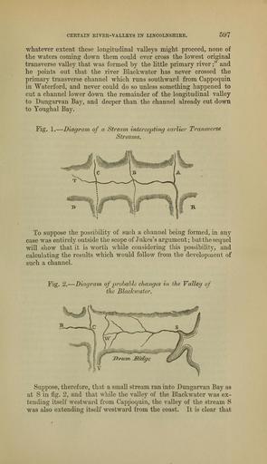 Keywords: The Quarterly journal of the Geological Society of London (13204896475).jpg CEETABSr EIVER-V ALLEYS IN LINCOLNSHIRE <br> 597 <br> whatever extent these longitudinal valleys might proceed none of <br> the waters coming down them could ever cross the lowest original <br> transverse valley that was formed by the little primary river ; and <br> he points out that the river Blackwater has never crossed the <br> primary transverse channel which runs southward from Cappoquin <br> in Waterford and never could do so unless something happened to <br> cut a channel lower down the remainder of the longitudinal valley <br> to Dungarvan Bay and deeper than the channel already cut down <br> to Toughal Bay <br> Fig 1 ” Diagram of a Stream intercepting earlier Transverse <br> Streams <br> To suppose the possibility of such a channel being formed in any <br> case was entirely outside the scope of Jukes's argument ; but the sequel <br> will show that it is worth while considering this possibility and <br> calculating the results which would follow from the development of <br> such a channel <br> Fig 2 ” Diagram of probable changes in the Valley of <br> the Blackwater <br> Suppose therefore that a small stream ran into Dungarvan Bay as <br> at S in fig 2 and that while the valley of the Blackwater was ex- <br> tending itself westward from Cappoquin the valley of the stream S <br> was also extending itself westward from the coast It is clear that 36929248 113681 51125 Page 597 Text 39 http //www biodiversitylibrary org/page/36929248 1883 Geological Society of London Biodiversity Heritage Library The Quarterly journal of the Geological Society of London v 39 1883 Geology Periodicals Smithsonian Libraries bhl page 36929248 dc identifier http //biodiversitylibrary org/page/36929248 smithsonian libraries Information field Flickr posted date ISOdate 2014-03-16 Check categories 2015 August 26 CC-BY-2 0 BioDivLibrary https //flickr com/photos/61021753 N02/13204896475 2015-08-26 12 51 43 cc-by-2 0 PD-old-70-1923 The Quarterly journal of the Geological Society of London 1883 Photos uploaded from Flickr by Fæ using a script |