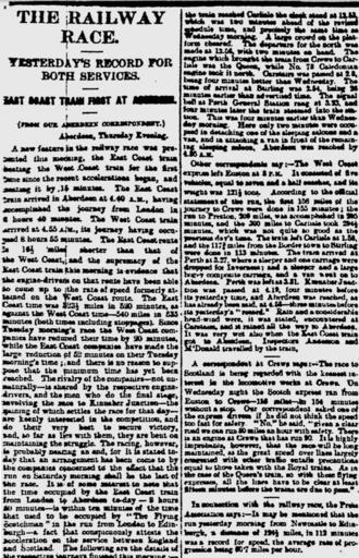Keywords: The Railway Race Glasgow Herald, 23 August 1895.jpg en Report in the Glasgow Herald of the w Race to the North by trains from London to Aberdeen 2013-05-01 19 03 02 Glasgow Herald 23 August 1895 Archived on Google News http //news google com/newspapers id KGVEAAAAIBAJ sjid 8rEMAAAAIBAJ pg 1383 2C4618404 Our Aberdeen Correspondent PD-old-70-1923 Uploaded with UploadWizard 1895 events in the United Kingdom Steam locomotive events Aberdeen railway station Newspaper clippings from the United Kingdom |