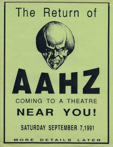 MAKE A MEME View Large Image The Return of Aahz on Saturday, September 7, 1991.jpg en Promotional flyer used by Beacham Theatre for The Return of Aahz event on Saturday September 7 1991 1991-08-24 Scanned image of a Beacham Theatre promotional flyer from September 1991 ...