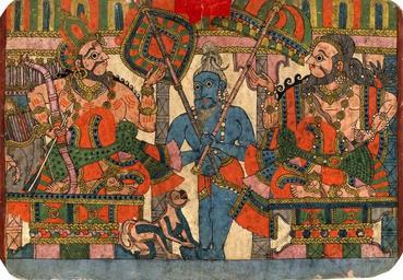 Keywords: The sage Vyasa and the king Janamejaya..jpg en Story-telling painting in gouache of the 'Paithan' type illustrating a narrative from the Mahabharata The sage Vyasa and the king Janamejaya With a background of a pillared hall the sage Vyasa seen here on the right narrates the story of Harishchandra to king Janamejaya Both characters are seated facing each other on decorated thrones with one knee resting on the seat and the other flexed bound by a yogapatta This detail signifies that they are steeped in a serious conversation The king carries the appurtenances of his status a crown on his head bow leaning on his shoulder arrow in his right hand and a filled quiver resting at his side The sage is elegantly dressed and bejewelled with matted hair knotted beard and a yajnopavita prominently shown across his chest incidentally the wrong way round it hangs from the right shoulder instead of hanging from the left Between Janamejaya and Vyasa stands a third person with matter hair and dressed in a loincloth possibly a disciple of the sage carrying a fan and an umbrella appurtenances of both gods and kings A monkey is shown frolicking at his feet 19thC late -20thC early http //www britishmuseum org/research/search_the_collection_database/search_object_details aspx objectid 3064002 partid 1 searchText mahabharata fromADBC ad toADBC ad numpages 10 images on orig 2fresearch 2fsearch_the_collection_database aspx currentPage 7 Paithan Style PD-Art Uploaded with UploadWizard Janamejaya Vyasa Loincloths in art |