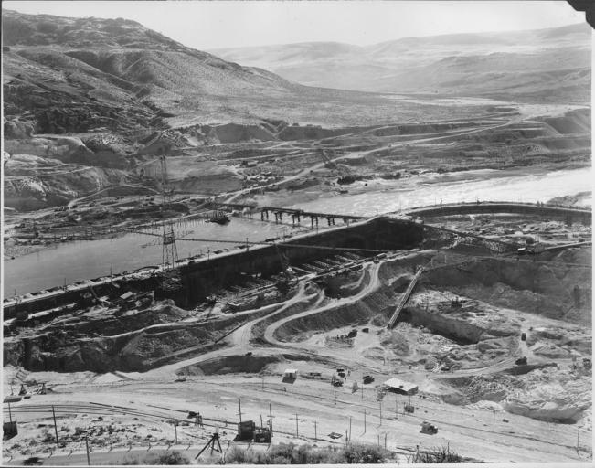 | Keywords: The southeast corner of the immense 3,000 foot Grand Coulee cofferdam - NARA - 293984.jpg Scope and content Photograph from Volume Two of a series of photo albums documenting the construction of the Grand Coulee Dam and related work on the Columbia Basin Project Full caption for this photograph reads The southeast corner of the immense 3 000 foot Grand Coulee cofferdam; between the cell clusters will be seen the timber struts in the section now being excavated for placing the first concrete in the Grand Coulee Dam; overhead is a portion of the 3 500 foot suspension bridge for transporting sand and gravel from the mixer stock piles to west side mixing plant; the trestle crossing the Columbia River carries the conveyor transporting excavated material from the east side; in the near right hand foreground is the bedrock on which the big dam will be built - a bed of dense solid granite known to be over 800 ft thick The Grand Coulee Dam across the Columbia River has a width at the base of 500 feet; will be 550 feet high from its foundation and 4 300 feet long containing over 11 000 000 cubic yards of concrete General notes 293984 Local identifier Department of the Interior Bureau of Reclamation Engineering and Research Center 05/18/1981 - 03/04/1988 NARA's Rocky Mountain Region Denver NRGA Building 48 Denver Federal Center West 6th Avenue and Kipling Street Denver CO 80225-0307 09/1935 Record group Record Group 115 Records of the Bureau of Reclamation 1889 - 2008 Record group ARC 444 Photograph albums compiled 1903 - 1972 Series ARC 293611 File unit File unit ARC Variant control numbers NAIL Control Number NRG-115-CONSTPHO85006-COLBASIN2689 Other versions <gallery> File The_southeast_corner_of_the_immense_3 000_foot_Grand_Coulee_cofferdam_-_NARA_-_293984 tif tif </gallery> NARA-cooperation PD-USGov Grand Coulee Dam |