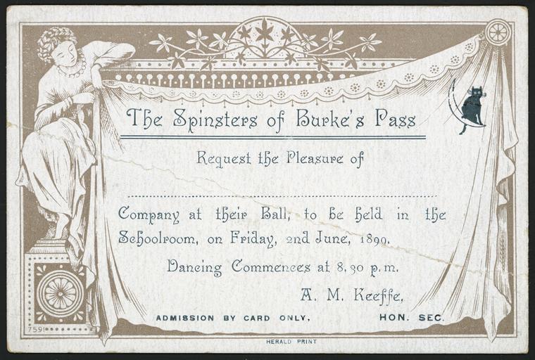 | Keywords: text writing document drawing photo border Invitation card to a ball. The name of the invitee is not filled in. The border incorporates the figure of a woman holding up the announcement, and there is a black cat sitting on a new moon in the top right corner. Quantity: 1 colour art print(s). Physical Description: Engraving, on card 77 x 115 mm. Provenance: Purchased in 2005. Timaru herald (Newspaper). The Spinsters of Burke's Pass request the pleasure of ...... company at their ball, to be held in the Schoolroom, on Friday, 2nd June, 1899. Dancing commences at 8.30 p.m. A M Keeffe, Hon. Sec. Herald Print [1899]. Ref: Eph-A-BALL-1899-01. Alexander Turnbull Library, Wellington, New Zealand. natlib.govt.nz/records/23036567 Invitation card to a ball. The name of the invitee is not filled in. The border incorporates the figure of a woman holding up the announcement, and there is a black cat sitting on a new moon in the top right corner. Quantity: 1 colour art print(s). Physical Description: Engraving, on card 77 x 115 mm. Provenance: Purchased in 2005. Timaru herald (Newspaper). The Spinsters of Burke's Pass request the pleasure of ...... company at their ball, to be held in the Schoolroom, on Friday, 2nd June, 1899. Dancing commences at 8.30 p.m. A M Keeffe, Hon. Sec. Herald Print [1899]. Ref: Eph-A-BALL-1899-01. Alexander Turnbull Library, Wellington, New Zealand. natlib.govt.nz/records/23036567 |