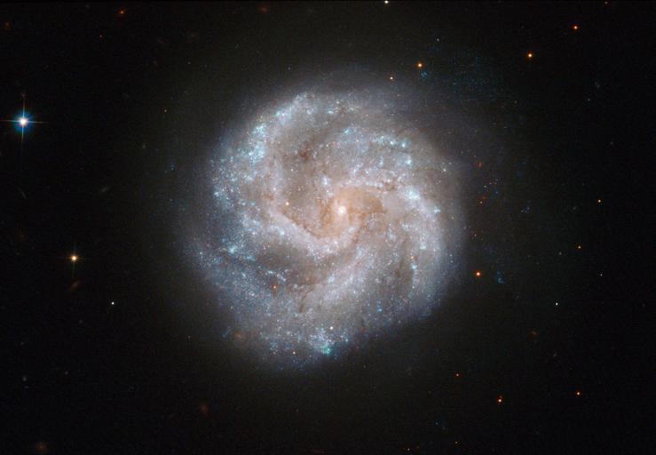 Keywords: ic 391 ic391 black background lunar texture Hubble's Advanced Camera for Surveys has captured this moment in the ever-changing life of a spiral galaxy called IC 391. Although these massive star cities appear static and unchanging, their stellar inhabitants are constantly moving and evolving, with new stars being born and old stars reaching the ends of their lives —often in spectacular fashion, with an immense supernova explosion that can be viewed from Earth. On 3 January 2001, members of the Beijing Astronomical Observatory discovered such an explosion within IC 391 and it was named SN 2001B. This was a Type Ib supernova, which occurs when a massive star runs out of fuel for nuclear fusion and collapses, emitting vast amounts of radiation and creating a powerful shock wave. Hubble has contributed much to our understanding of supernovae in recent years, and it has made an extensive study of supernova 1987A (heic0704), the brightest such stellar explosion to be seen from Earth in over 400 years. IC 391 lies about 80 million light-years away in the constellation of Camelopardalis (the Giraffe) in the far northern part of the sky. The British amateur observer William Denning discovered it in the late nineteenth century, and described it as faint, small and round. This picture was assembled from images taken with Hubble’s Wide Field Channel on the Advanced Camera for Surveys. Images through a blue filter (F435W) were coloured blue, those through a green filter (F555W) are shown as green and those through a near-infrared filter (F814W) are shown in red. The exposure times were 800 s, 700 s and 700 s respectively and the field of view is 2.1 by 1.4 arcminutes. Hubble's Advanced Camera for Surveys has captured this moment in the ever-changing life of a spiral galaxy called IC 391. Although these massive star cities appear static and unchanging, their stellar inhabitants are constantly moving and evolving, with new stars being born and old stars reaching the ends of their lives —often in spectacular fashion, with an immense supernova explosion that can be viewed from Earth. On 3 January 2001, members of the Beijing Astronomical Observatory discovered such an explosion within IC 391 and it was named SN 2001B. This was a Type Ib supernova, which occurs when a massive star runs out of fuel for nuclear fusion and collapses, emitting vast amounts of radiation and creating a powerful shock wave. Hubble has contributed much to our understanding of supernovae in recent years, and it has made an extensive study of supernova 1987A (heic0704), the brightest such stellar explosion to be seen from Earth in over 400 years. IC 391 lies about 80 million light-years away in the constellation of Camelopardalis (the Giraffe) in the far northern part of the sky. The British amateur observer William Denning discovered it in the late nineteenth century, and described it as faint, small and round. This picture was assembled from images taken with Hubble’s Wide Field Channel on the Advanced Camera for Surveys. Images through a blue filter (F435W) were coloured blue, those through a green filter (F555W) are shown as green and those through a near-infrared filter (F814W) are shown in red. The exposure times were 800 s, 700 s and 700 s respectively and the field of view is 2.1 by 1.4 arcminutes.