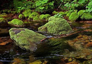 Keywords: the stones overgrown river torrent stream water flowing moss plants green current reflection heave transparency lichens bottom of the river the purity of the nature