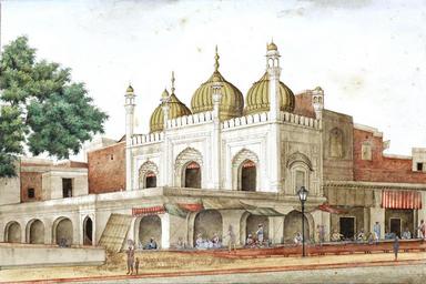 | Keywords: The Sunehri Masjid of Roshan ud-Dawla at Chandni Chowk in Delhi - a painting by Ghulam Ali Khan 026b.jpg Masjid Roshun ood Daulah near the Kotuabe at Delhee The Sunehri Masjid Golden Mosque of Roshan ud-Dawla at Chandni Chowk near Kutwali in Delhi A series of 31 paintings by Ghulam Ali Khan fl 1817-55 consisting of views of monuments in and around Delhi and including four portraits of the last Mughal Emperor Bahadur Shah II reg 1837-58 and his sons Watercolour and gold on paper black margin rules three title pages three sheets of portraits all with identifying inscriptions in English and in Persian in nasta'liq script in black ink the portraits with further inscriptions in nasta'liq script with the date November 1852 Christian date written in Arabic in later mounts loose in contemporary green leather-covered despatch box the lid embossed in gold DELHEE 1854 Size paintings 290 x 215 mm and slightly smaller; mounts 318 x 394 mm ; box 435 x 365 x 110 mm File Ghulam Ali Khan 026 jpg circa 1852 1854 Ghulam Ali Khan PD-Art-100 Sunehri Masjid Chandni Chowk |