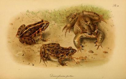 Keywords: The tailless batrachians of Europe (6216965875).jpg 126 <br> DTSCOGLOSSIDiE <br> Vomerine teeth in a long straight or slightly <br> curved series narrowly interrupted in the middle <br> behind the choanse and extending outwards to the <br> Fig 48 vertical of their outer borders or even <br> a little beyond Tongue moderately <br> large circular thick adherent scarcely <br> free behind <br> Head much depressed a little broader <br> than long ; snout rounded or obtusely <br> pointed projecting considerably be- <br> yond the mouth as long as or a little <br> Open mouth logger than the diameter of the orbit ; <br> no canthus rostralis ; dorsal region slightly grooved ; <br> nostril a little nearer the tip of the snout than the <br> eye ; eye moderate ; interorbital space as broad as or <br> a little narrower than the upper eyelid and equal to <br> the distance between the nostrils; tympanum measur- <br> ing three-fifths to two-thirds the diameter of the eye <br> sometimes feebly distinct often completely hidden <br> Fig 49 <br> Heads of males upper views A Coruniia b Oran c Tlemseu <br> D Sardinia 36107811 111303 52023 Blank 1 http //www biodiversitylibrary org/page/36107811 1897 10 5962/bhl title 52023 Boulenger George Albert Biodiversity Heritage Library The tailless batrachians of Europe v 1 Amphibians Europe Frogs SIL Smithsonian Institution Libraries bhl page 36107811 dc identifier http //biodiversitylibrary org/page/36107811 Taxonomy Order Anura sil smithsonian institution libraries taxonomy order anura Information field Flickr posted date ISOdate 2011-10-06 CC-BY-2 0 BioDivLibrary https //flickr com/photos/61021753 N02/6216965875 2015-09-01 06 28 00 cc-by-2 0 PD-old-70-1923 Frogs in art The tailless batrachians of Europe Photos uploaded from Flickr by Fæ using a script