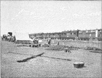 | Keywords: The Tale of a Field Hospital 1900 - Face page 4 - Kitchen of the field hospital.png under the photograph reads THE KITCHEN OF THE FIELD HOSPITAL The cross-shaped ditch cut in the ground takes the kettles according to the way of the wind The ambulance train has drawn up Кухня 4-го полевого госпиталя асположенного на станции Ф и 20 км севе нее Эстко та во в емя Англо-бу ской войны 1899 1902 В к естооб азную канаву ставятся котелки в зависимости от нап авления вет а а заднем плане санита ный поезд Фотог афия Ф еде ика Т ивза из его книги «Рассказ о полевом госпитале» 1900 «The Tale of a Field Hospital» cite book Frederick Treves 1900 London Paris New York Melbourne The Tale of a Field Hospital Cassell and Company Limited Face p 4 First Edition October 1900 Reprinted November 1900 December 1900 Retrieved from the Internet Archive http //www archive org/stream/taleoffieldhospi00trev page/n17/mode/2up link extracted from taleoffieldhospi00trev_orig_jp2 tar Modifications by the uploader rotated cropped some dust scratches removed the uncleaned version is available in the file history levels converted to grayscale between 1899 1900 Creator Frederick Treves <ref> cite journal Jeffcoate Stephen The retrieval of Ladysmith 29 July 2000 The Lancet 356 9227 417-421 doi 10 1016/S0140-6736 00 02540-X published in seven episodes in the British Medical Journal and later collected with his own photographs in his book The Tale of a Field Hospital Treves wrote of the </ref> PD-old References references Second Boer War field hospitals Frederick Treves Ambulance trains Ambulances in the 1900s Second Boer War in 1900 British Medical Journal |