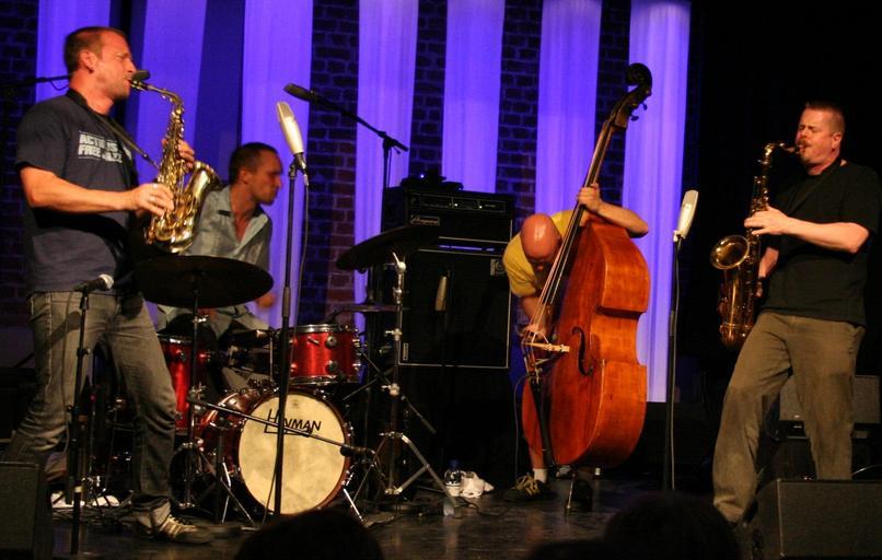 Keywords: The Thing at Kongsberg Jazzfestival.JPG en Nowegian/Swedish free jazz trio The Thing plays with Ken Vandermark at Kongsberg Jazzfestival 2008 Kongsberg Norway From left Mats Gustafsson Sweden Paal Nilssen-Love Norway Ingebrigt Håker Flaten Norway Ken Vandermark Sweden 2008-07-03 own Nittentrikken cc-zero Uploaded with UploadWizard Ken Vandermark Kongsberg Jazzfestival 2008 The Thing