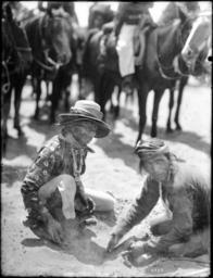 Photograph of the two chiefs of the Navajos burying the rooster for the game of plucking the rooster, ca.1900. They crouch as one digs with his right hand. They wear long-sleeved shirts, pants, and some necklaces. One wears a hat, while the other wears a bandanna around his head. Several men on horses stand behind them.