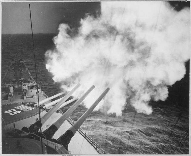 | Keywords: The USS Missouri fires 16-inch shell into enemy lines at Hungnam. A 16-inch 3-gun salvo is on its way to commies. - NARA - 520788.tif Scope and content General notes Use War and Conflict Number 1445 when ordering a reproduction or requesting information about this image 520788 Local identifier 80-G-426954 Department of Defense Department of the Navy Naval Photographic Center 09/18/1947 - Still Picture Records Section Special Media Archives Services Division NWCS-S National Archives at College Park 8601 Adelphi Road College Park MD 20740-6001 date 1950 12 26 Record group Record Group 80 General Records of the Department of the Navy 1804 - 1983 Record group ARC 409 General Photographic File of the Department of Navy compiled 1943 - 1958 documenting the period 1900 - 1958 Series ARC 520587 File unit File unit ARC Variant control numbers NAIL Control Number NWDNS-80-G-426954 yes Other versions NARA-cooperation PD-USGov Weapons and weapons' stations on the USS Missouri BB-63 1944-1955 Black and white photographs Firing naval artillery 16 /50 caliber Mark 7 gun Naval shore bombardment in the Korean War |