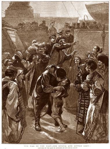 | Keywords: The War in the East - Big Russia and Little Serbia.jpg en The War in the East - Big Russia and Little Serbia depicting Russian volunteers arriving in Smederevo by boat welcomed by Serbs An old Russian hugs a Serbian boy and another man plays with a toddler while a third greets the crowd 1876 ru Русский волонте целует се бку sr Руски војник доб овољац љуби с пског дечака по иск цавању у Смеде еву 1876 The Graphic 1876 http //www staresrpskeslike com Creator Author of this file is dead more then 70 years PD-old Relations of Russia and Serbia Serbian Ottoman War 1876 78 Russo-Turkish War 1877 1878 History of Smederevo Military alliance propaganda The Graphic 1876 |