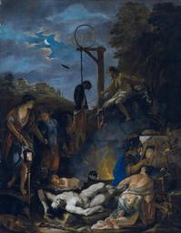 | Keywords: The witches' Sabbath by moonlight, by Domenicus van Wijnen, called Ascanius.jpg en The witches' Sabbath by moonlight oil on canvas 73 x 57 5 cm signed b l DW F century 17 http //www sothebys com/en/auctions/ecatalogue/2016/old-master-british-paintings-day-l16034/lot 131 html Sotheby's Creator Domenicus van Wijnen other versions Custom license marker 2016 09 24 PD-old-100 Domenicus van Wijnen | ||||