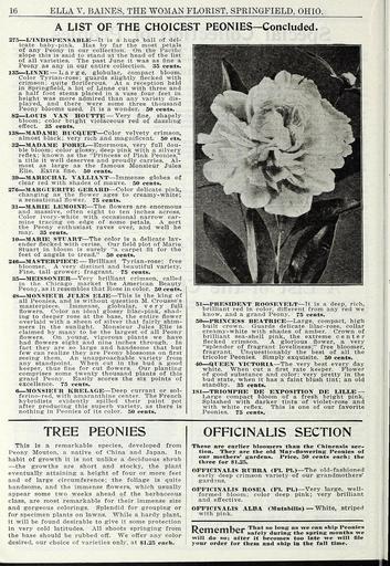 Keywords: The wonderful new rose hoosier beauty (16387831672).jpg 16 <br> ELLA V BAINES THE WOMAN FLORIST SPRINGFIELD OHIO <br> A LIST OF THE CHOICEST PEONIES Concluded <br> 275 L'INDISPENSABLE It is a huge ball of del- <br> icate baby-pink Has by far the most petals <br> of any Peony in our collection On the Pacific <br> slope this is said to stand at the head of the list <br> of all varieties The past June it was as fine a <br> Peony as any in our entire collection 35 cents <br> 135 LINNE Large globular compact bloom <br> Color Tyrian-rose; guards slightly necked with <br> crimson; quite floriferous At a reception held <br> in Springfield a lot of Linne cut with three and <br> a half foot stems placed in a vase four feet in <br> height was more admired than any variety dis- <br> played and there were some three thousand <br> Peony blooms used It is a wonder 50 cents <br> 82 LOUIS VAN HOXJTTE Very fine shapely <br> bloom; color bright violaceous red of dazzling <br> effect 35 cents <br> 138 MADAME BUCQUET Color velvety crimson <br> almost black; very rich and magnificent 50 cts <br> 32 MADAME FOREL Enormous very full dou- <br> ble bloom; color glossy deep pink with a silvery <br> reflex; known as the Princess of Pink Peonies <br> a title it well deserves and proudly carries Al- <br> most as large as the famous Monsieur Jules <br> Elie Extra fine 50 cents <br> 39 MARECHAL VALLIANT Immense globes of <br> clear red with shades of mauve 50 cents <br> 276 MARGUERITE GERARD Color delicate pink <br> changing as the flower ages to creamy- white; <br> a sensational flower 75 cents <br> 31 MARIE LEMOINE The flowers are enormous <br> and massive often eight to ten inches across <br> Color ivory-white with occasional narrow car- <br> mine tracing on edge of some petals A sort <br> the Peony enthusiast raves over and well he <br> may 35 cents <br> 10 MARIE STUART The color is a delicate lav- <br> ender flecked with cerise Our field plot of Marie <br> Stuart in bloom is surely a carpet fit for the <br> feet of angels to tread 50 cents <br> 246 MASTERPIECE Brilliant Tyrian-rose; free <br> bloomer A very distinct and beautiful variety <br> Fine tall grower; fragrant 75 cents <br> 35 MEISSONIER Very brilliant crimson called <br> in the Chicago market the American Beauty <br> Peony as it resembles that Rose in color 50 cents <br> 48 MONSIEUR JULES EL D3 This is the king of <br> all Peonies and is without question M Crousse's <br> masterpiece Immense globular very full <br> flowers Color an ideal glossy lilac-pink shad- <br> ing to deeper rose at the base the entire flower <br> overlaid with a sheen of silver that fairly shim- <br> mers in the sunlight Monsieur Jules Elie is <br> claimed by many to be the largest of all Peony <br> flowers On young vigorous plants we have <br> had flowers eight and nine inches through In <br> fact they are so large and handsome that but <br> few can realize they are Peony blossoms on first <br> seeing them An unapproachable variety from <br> any standpoint When cut in the bud a good <br> keeper thus fine for cut flowers Our planting <br> comprises some twenty thousand plants of this <br> grand Peony Easily scores the six points of <br> excellence 75 cents <br> 6 MONSIEUR KRELAGE Deep currant or sol- <br> ferino-red with amaranthine center The French <br> hybridists evidently spilled their paint pot <br> after producing this superb variety as there is <br> nothing in Peonies of its color 50 cents <br> ffHWI'fjMh <br> 51 PRESIDENT ROOSEVELT It is a deep rich <br> brilliant red in color different from any red we <br> know and a grand Peony 75 cents <br> 50 PRINCESS BEATRICE Large compact high <br> built crown Guards delicate lilac-rose collar <br> creamy-white with shades of amber Crown of <br> brilliant sea-shell pink the extreme center <br> flecked crimson A glorious flower a very <br> splendor of fragrant loveliness; free bloomer <br> fragrant Unquestionably the best of all the <br> tricolor Peonies Simply exquisite 50 cents <br> 40 QUEEN VICTORIA The very best every day <br> white When cut a first rate keeper Flower <br> of good substance and color; very pretty in the <br> bud state when it has a faint blush tint; an old <br> standby 35 cents <br> 181 TRIOMPHE DE EXPOSITION DE LILLE <br> Large compact bloom of a fresh bright pink <br> Splashed with darker tints of violet-rose and <br> with white reflex This is one of our favorite <br> Peonies 75 cents <br> TREE PEONIES <br> This is a remarkable species developed from <br> Peony Mouton a native of China and Japan In <br> habit of growth it is not unlike a deciduous shrub <br> the growths are short and stocky the plant <br> eventually attaining a height of four or more feet <br> and of large circumference; the foliage is quite <br> handsome and the immense flowers which usually <br> appear some two weeks ahead of the herbaceous <br> class are most remarkable for their immense size <br> and gorgeous colorings Splendid for grouping or <br> for specimen plants on lawns While a hardy plant <br> it will be found desirable to give it some protection <br> in very cold latitudes All shoots springing from <br> the base should be rubbed off We offer any color <br> desired our choice of varieties only at 1 25 each <br> OFFICINALIS SECTION <br> These are earlier hloomers than the Chinensis sec- <br> tion They are the old May-flowering Peonies of <br> our mothers' gardens Price 50 cents each; the <br> three for 1 25 <br> OFFICINALIS RUBRA PI PI The old-fashioned <br> early deep crimson variety of our grandmothers' <br> gardans <br> OFFICINALIS ROSEA Fl PI Very large well- <br> formed bloom; color deep pink; very brilliant <br> and effective <br> OFFICINALIS ALBA Mntabilis White Striped <br> with pink <br> Ppmomhpr That so long as we can ship Peonies <br> rVCllldllUd safely during the spring months ire <br> will do so; after it becomes too late we will file <br> your order for them and ship in the fall time 41856315 131010 64616 Page 16 