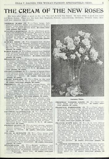 Keywords: The wonderful new rose hoosier beauty (16386994931).jpg ELLA V BAINES THE WOMAN FLORIST SPRINGFIELD OHIO <br> THE CREAM OF THE NEW ROSES <br> We here offer what is good in the new Tea and Hybrid Tea Roses To have what is good you must <br> try these Roses They are the best that England France Luxembourg Germany Ireland Italy Hol- <br> land and America can produce <br> ADMIRAL WARD H T ” Very large full <br> globular flowers freely and continuously pro- <br> duced Color deep velvety crimson-red shaded <br> fiery-red A grand garden Rose 25 cents; two- <br> year plants 50c cents <br> AUGUSTUS HARTMANN H T ” Brilliant gera- <br> nium-red flushed with orange; flowers of large <br> size and beautifully formed The color is very <br> striking and distinct It obtained three silver <br> medals in 1913 as the best bloom in the <br> show Very fine 25 cents; two-year plants <br> 50 cents <br> AUTUMN TINTS H T ” Coppery-red shaded <br> with orange and salmon; flowers produced in <br> great profusion An exceedingly attractive <br> garden Rose Similar in color to Mme Edward <br> Herriott Very lovely 25 cents; two-year <br> plants 50 cents <br> BARON PALM H T ” Pure velvety red flushed <br> deep yellowish-red and vermilion; large full <br> and of good substance; fine both for garden <br> culture and for cut flowers 25 cents; two-year <br> plants 50 cents <br> BRILLL4 NT H T ” Flowers large and full and <br> produced continuously throughout the season <br> in endless profusion Color the most intense <br> scarlet the brightest color yet achieved in <br> Roses the fiery brilliance of which is quite <br> startling The most brilliant bedding Rose in <br> existence Gold medal N R S 25 cents; two- <br> year plants 50 cents <br> CECILE CUSTERS H T ” Inside of petals lilac- <br> rose reverse deep rose-pink; large flower car- <br> ried on long stems; growth vigorous and very <br> floriferous Extra 25 cents; two-year-old <br> plants 50 cents <br> CHAMP WEILAND H T ” This is the new <br> Killarney; said to be a great improvement <br> 25 cents; two-year plants 50 cents <br> CHEERFUL H T ” Pure orange-flame the <br> flame tints overspreading the petals giving it <br> a wonderful and pleasing effect Together <br> with the distinct orange-yellow base creates <br> a combination of color hitherto unknown in <br> Roses The blooms are very large and full of <br> perfect shape and form with enormous petals <br> It flowers freely and continuously all season <br> Superb 25 cents; two-year plants 50 cents <br> COLLEEN H T ” Brilliant rose shaded rose- <br> pink with deeper rose-crimson veneering and <br> distinct creamy-yellow ground never fading <br> until the petals drop The flower is quite full <br> with enormous petals and high pointed center <br> forming the noblest and most remarkable flower <br> among Roses Very free-blooming and smooth <br> Gold medal Rose of the National Rose Society of <br> England 1913 25 cents; two-year plants 50 cts <br> COUNTESS CLANWILLIAM H T ” Flowers very <br> large and full produced in endless abundance; <br> buds long and pointed opening to large full high <br> centered flowers of great beauty and refinement <br> Color delicate peach-pink at the base of the <br> petals which are flamed and heavily edged with <br> deep cherry-red a beautiful contrast of color A <br> charming Rose Gold medal N R S 25 cents; <br> two-year 50 cents <br> CRIMSON QUEEN H T ” A very strong upright <br> grower flower large and full Color a rich bright <br> velvety crimson A grand garden Rose as it is <br> always in bloom 25 cents; two-year plants <br> 50 cents <br> EDGAR M BURNETT H T ” Very large full <br> flowers of fine shape and form with large flesh <br> petals tinted rose Said to be a great improve- <br> ment on La France and may be regarded as an <br> advance on the type of Lady Alice Stanley; un- <br> doubtedly the sweetest scented Rose in existence <br> As a garden Rose unequaled 25 cents; two-year <br> plants 50 cents <br> ETINCELANTE H T ” Bright brilliant red <br> shaded with purple large full and of fine form <br> opening into an enormous bouquet of fragrance; <br> bud elongated of brilliant velvety crimson color <br> zs flowering Extra fine 35 cents; two-year <br> O cents <br> Autumn Tints <br> FREIFRAU VONDER GOLTZ H T ” Rosy-sal- <br> mon large full and fragrant 35 cents; two- <br> year plants 60 cents <br> FLORENCE FORRESTER H T ” Clear snow- <br> white with a lemon tinge; as the flowers age they <br> become a pure white; the blooms are even larger <br> than Paul Neyron Its habit is absolutely per- <br> fect and the freedom with which it flowers is <br> marvelous We consider this Rose the grandest <br> of all whites for bedding For size and substance <br> has no equal among Hybrid Teas Is very sweetly <br> perfumed Gold medal National Rose Society <br> 25 cents; two-year plants 50 cents <br> FRANCIS SCOTT KEY H T ” It is very fitting <br> that such a fine new Rose should be honored – with <br> the name of the author of the Star Spangled <br> Banner and also that it should hail from Balti- <br> more one of whose forts was being assailed when <br> the inspiration came to the author to write our <br> national anthem The flowers are from large to <br> very large with sixty or more petals opening to <br> a high center The color is a magnificent deep <br> red rose Wherever it has been staged this Rose <br> has swept all competitors from the boards and <br> secured every prize it has entered for Grand <br> for the garden 25 cents; two-year plants 5Β© <br> cents <br> G AMEDEE HAMMOND H T ” The color is cad- <br> mium or deep apricot egg yolk shading off to <br> fawn cr delicate buff Blooms large full per- <br> fectly formed; very floriferous and very fra- <br> grant A great acquisition and a Rose we set <br> great store on 35 cents; two-year plants 6Β© <br> cents 41856328 131010 64616 Page 3 Text http //www biodiversitylibrary org/page/41856328 1918 10 5962