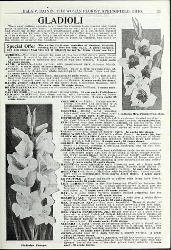 | Keywords: The wonderful new rose hoosier beauty (16362817496).jpg ELLA V BAINES THE WOMAN FLORIST SPRINGFIELD OHIO <br> 33 <br> GLADIOLI <br> Their easy culture appeals to all and the freedom from disease and insect <br> pests is another great asset It associates so well with all garden flowers <br> but above all is the decorative possibilities both as a cut flower subject <br> and also in the garden Our collection we here offer are unsurpassed and <br> will be a source of great delight to all who plant them The flowers last a <br> long time when cut Do not be stingy in planting Gladioli but plant by <br> the dozen or even by the hundred <br> QnArial dfff f The entire forty-one varieties of choicest Gladioli <br> °K CW U VUBI costing 3 52 sent for only 2 75 A great bargain <br> and you cannot beat this set of Gladioli no matter from whom you buy <br> AMERICA Too much cannot be said of this beautiful dainty pink tinted <br> lavender It is sold by the millions to florists who use it for cut flowers <br> The flowers are of immense size and of wax-like texture 6 cents each; <br> 50 cents dozen <br> ANNIE WIGMAN Light yellow with pronounced dark crimson blotch; <br> superb 6 cents each; 50 cents dozen <br> APOLIiO A very large wide open flower Color a deep begonia-rose al- <br> most scarlet with delicate white markings in the throat New and fine <br> 15 cents each; 1 50 dozen <br> AUGUSTA Opens delicate pink changing to pure white If cut just as the <br> first bud begins to open and kept inside it opens pure white with blue <br> anthers Largely used by florists for cut flowers 6 cents each; 50c dozen <br> BARON JOSEF HULOT One of the finest deep violet-blue Gladioli with <br> well opened flowers 6 cents each; 50 cents dozen <br> BRENCHLEYENSIS Intense vermilion-scarlet very brilliant 6 cents each; <br> 50 cents dozen <br> CANARY BIRD Fine lemon-yellow; strong spike 10 cts each; 1 00 dozen <br> CHICAGO WHITE A fine white variety with lavender stripes on lower <br> petals From seven to eight flowers open at one time 7 cents each; 65 <br> cents dozen <br> Gladiolus Mrs Frank Pendleton <br> Gladiolus Europa <br> COLUMBIA Light orange-scarlet <br> freely blotched and penciled with <br> blush-purple Throat freely mot- <br> tled 10 cents each; 1 00 dozen <br> ELECTRA Bright and pleasing <br> brick-red; one of the earliest vari- <br> eties 15 cents each; 1 50 dozen <br> EMPRESS OF INDIA A rich dark velvety crimson shaded royal pur- <br> ple Certificate of merit from Haarlem and London 8c each; 80c doz <br> EUROPA A very fine snow white Gladiolus of perfect form with <br> many pure white blooms open at once The formation is close <br> and compact making a magnificent spike of wide open flowers <br> 12 cents each; 1 25 dozen <br> FAUST Wine-red immense flower; extra 5c each; 50c dozen <br> FRED WIGMAN Bright red with yellow throat 6c each; 50c doz <br> GLORY OF HOLLAND A new white with sligl t tinting of blush- <br> pink and anthers of delicate lavender; blooms large and grace- <br> fully set on a tall spike 6 cents each; 50 cents dozen <br> GOLDEN KING A brilliant golden-yellow with intense crimson <br> blotch in throat making a striking contrast; one of the best <br> 15 cents each; 1 50 dozen <br> GOLDEN WEST One of the best exhibition varieties on account of <br> its distinctive markings the color being a clear orange-scarlet <br> the lower petals blazed with golden-yellow faintly suffused with <br> violet shadings The individual flowers are of large size and <br> seem to stand out boldly making it very noticeable in any collec- <br> tion 8 cents each; 80 cents dozen <br> HALLEY A most attractive early blooming sort with large well- <br> opened flowers of delicate salmon-pink flowers well placed on <br> long graceful spikes; a most beautiful variety 5c each; 50c dozen <br> HOLLANDIA A dainty Gladiolus with beautiful shadings of apricot; <br> very fine in combination with Baron Josef Hulot 5 cents each; <br> 50 cents dozen <br> LE PACTOLE A beautiful shade of yellow with large dark blotch <br> 5 cents each; 50 cents dozen <br> LILY LEHMAN This is the lily-flowering Gladiolus because the <br> flowers resfrr ble the Lily A pure glistening white with just the <br> faintest ti ting of pink on tips of the petals; matchless in form <br> and colori g 7 cents each; 65 cents dozen <br> MAY A n cable white variety lightly -flecked crimson; fine for <br> forcing 7 cents each; 65 cents dozen <br> MEADOW VALE White with lilac throat a very pretty white flow- <br> ering Gladiolus 7 cents each; 65 cents dozen <br> MRS FRANCIS KING The most beautiful Besnard shade of <br> flame-pink immense flowers on a spike growing four feet high <br> with from eighteen to twenty flowers six to eight of which are <br> open at one time; a magnificent variety 6 cents each; 50 cts doz <br> MRS FRANK PENDLETON JR Bright rose-pink on a pure white <br> ground A giant blotch of richest blood-red on lower petals; as <br> showy as any Orchid No grander variety in existence Awarded <br> the highest honors of the American Gladiolus Society Always <br> a prize winner 15 cents each; 1 50 dozen <br> NIAGARA A light Crocus or primrose-yellow slightly tinted with <br> rose-pink in throat; large open flowers on a strong spike For <br> color texture and keeping qualities this Gladiolus is one of the <br> very best 10 cents each; 1 00 dozen <br> ORION Light rose with dark blotch; a superb variety 5 cents <br> each; 50 cents dozen <br> PANAMA The companion to America which has become very pop- <br> ular A perfect Hermosa-pink in color with wide open wax-like <br> flowers; one of the best of the clear pinks; many awards 8 cents <br> each; 80 cents dozen 41856298 131010 64616 Page 33 Text http //www biodiversitylibrary org/page/41856298 1918 10 5962/bhl title 64616 Ella V Baines Firm ; Henry G Gilbert Nursery and Seed Trade Catalog Collection NameFound Hollandia NameConfirmed Hollandia EOLID 68431 NameBankID 2991467 NameFound Orchid Biodiversity Her